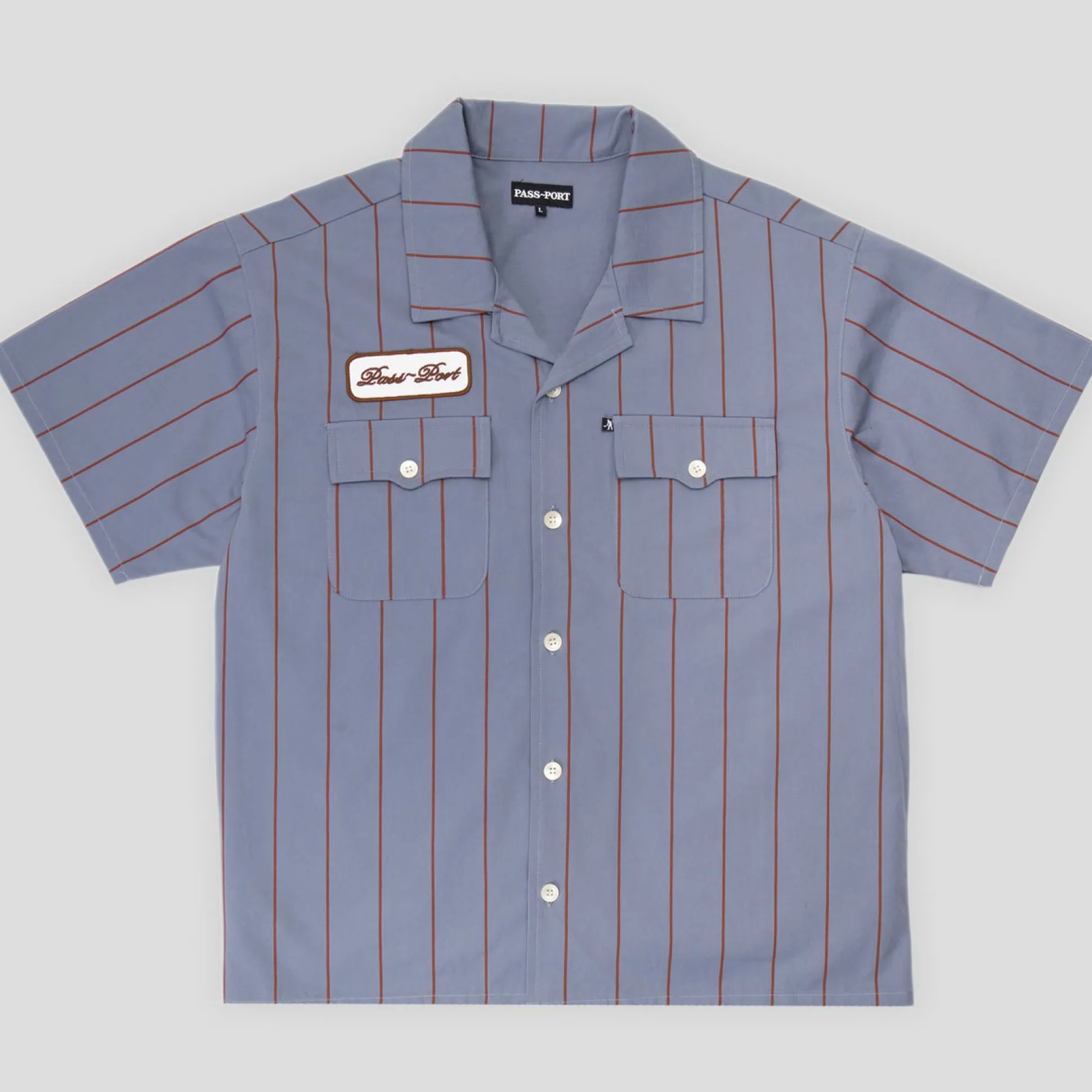 Pass~Port Striped casual shirt in light blue from range #42. The casual button up is made from 100% cotton with embroidery patch above the pocket on front. The Pass~Port button up shirt sources 100% recycled buttons for all products utilising materials to be repurposed.