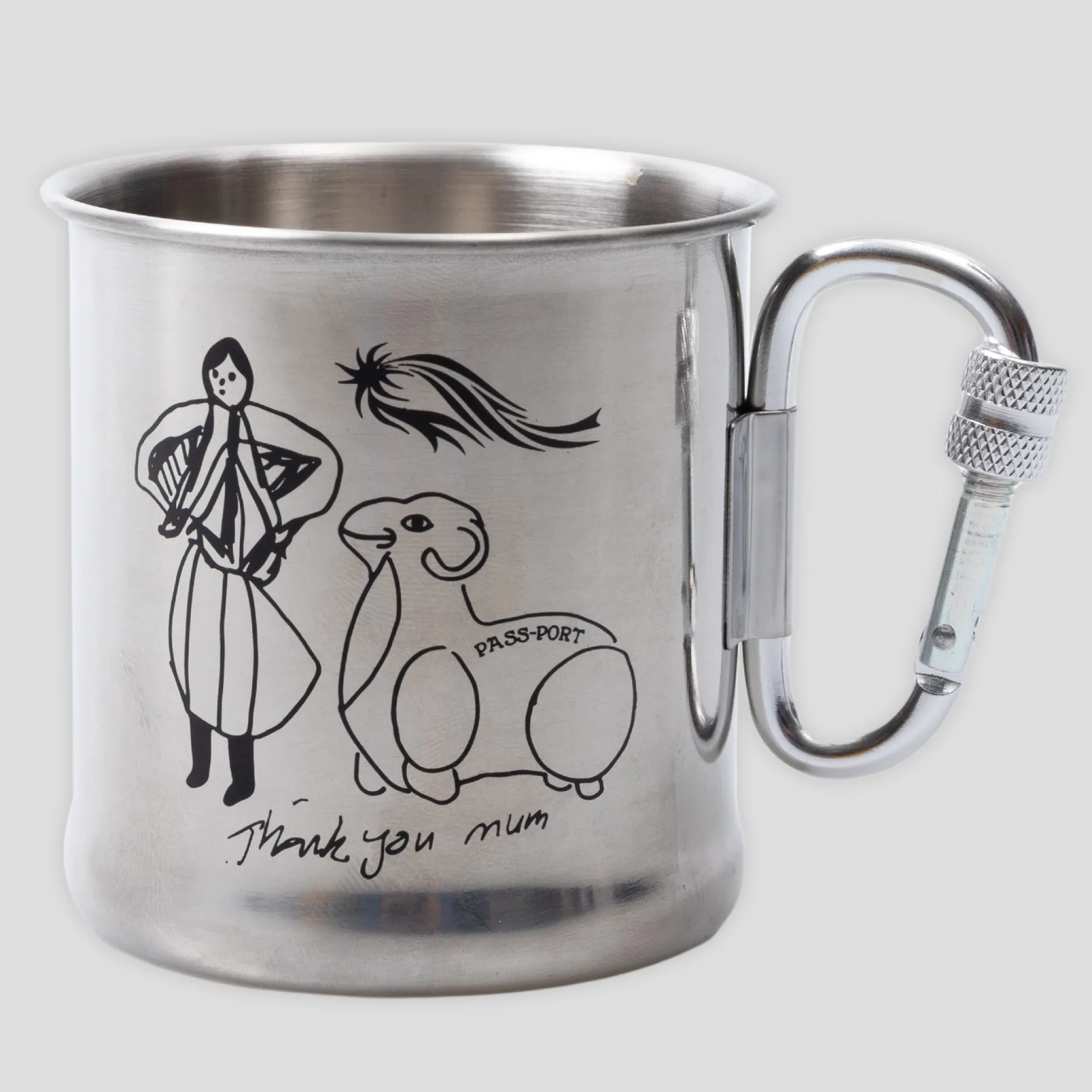 Pass~Port Thank You Mum Carabiner Mug from range #44. The carabiner mug is a stainless steel camp mug with built in carabiner handle and printed artwork by Shanon Rush.