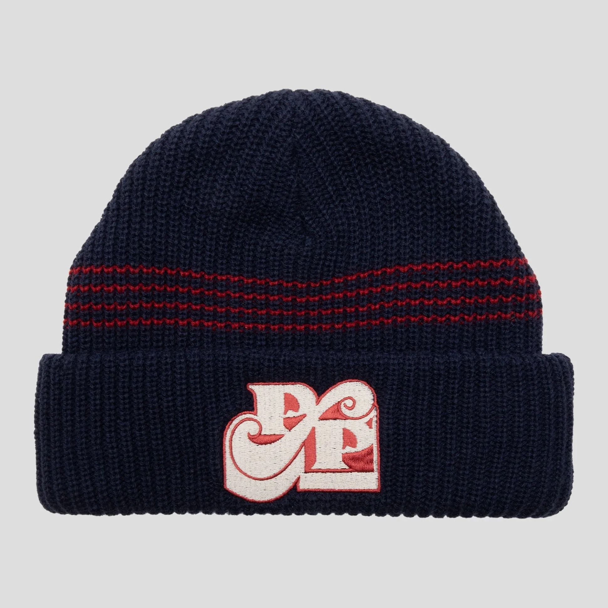 Pass~Port Tilde Stamp beanie in navy from range #42. The Pass~Port beanie is made from 100% acrylic, the beanie features embroidered graphic on front with contrast stripe which is finished in the classic Pass~Port beanie fit.
