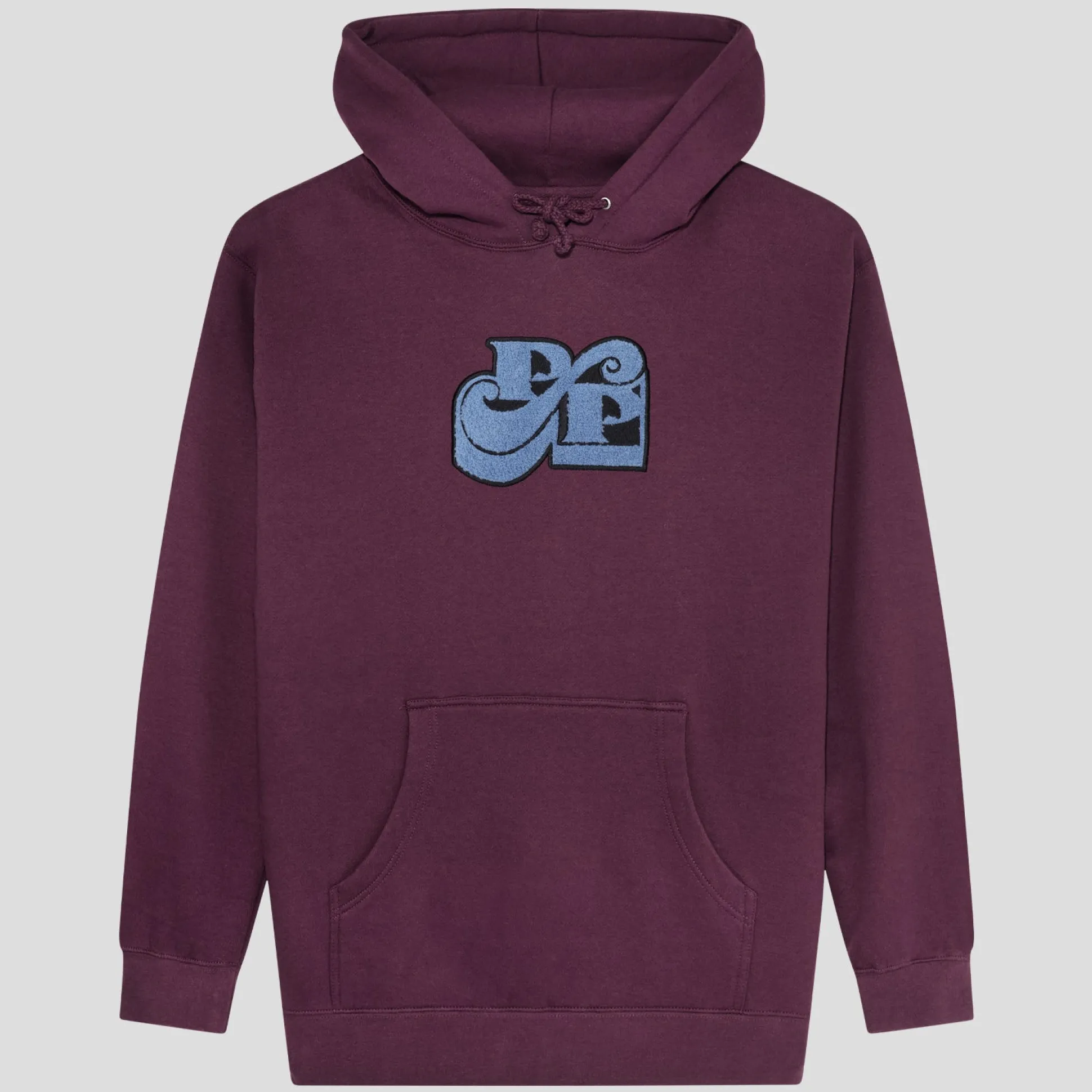 Pass~Port Tilde Stamp Hoodie in berry from range #42. The Pass~Port jumper is made from a cotton polyester blend and features embroidered chenille patch on front which is finished in the classic Pass~Port hood fit.