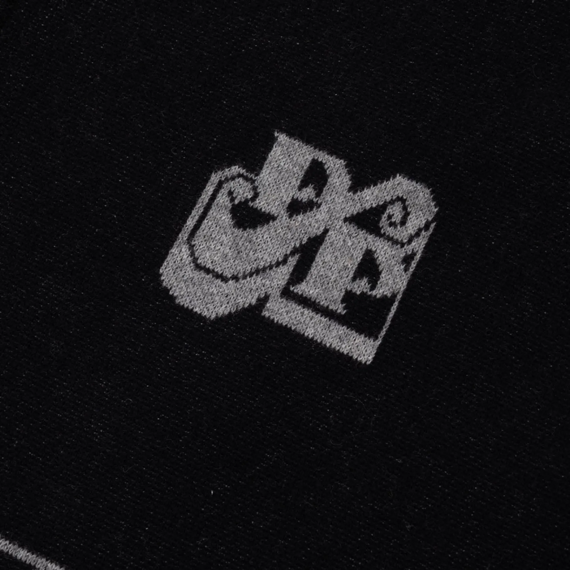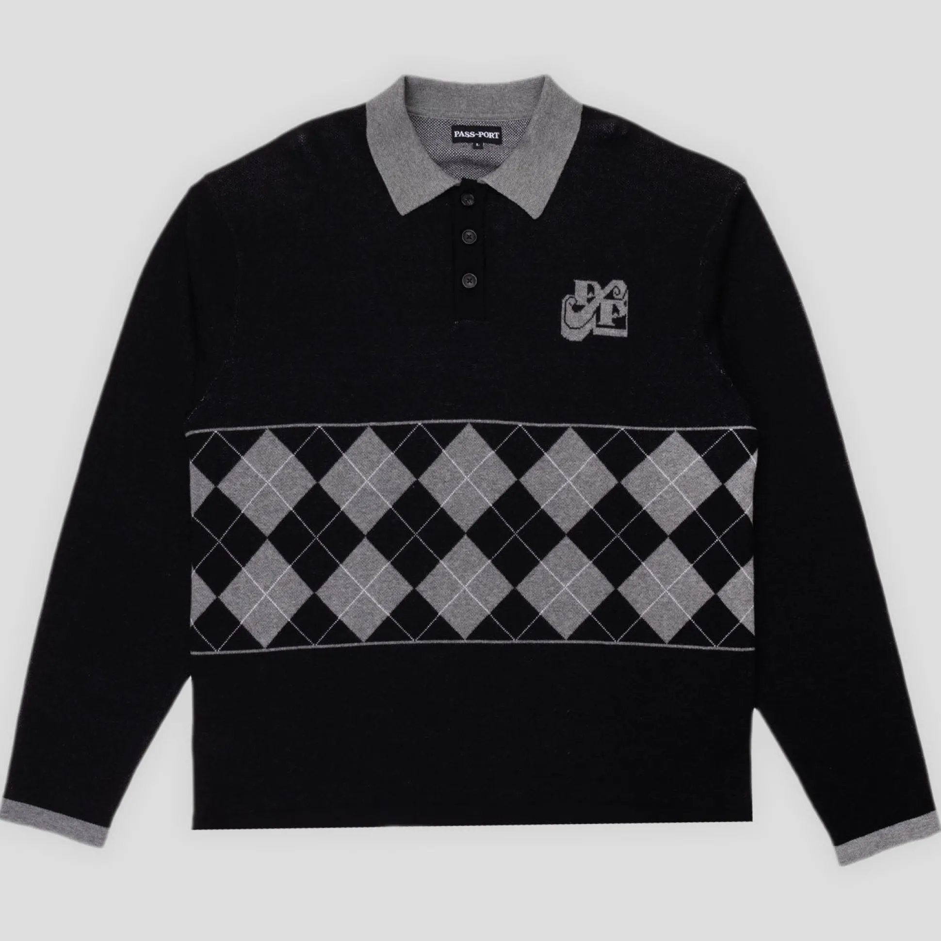 Pass~Port Tilde Stamp Knit Long-sleeve Polo in black from range #42. The Knit Polo shirt is made from 100% cotton jacquard and features recycled buttons.