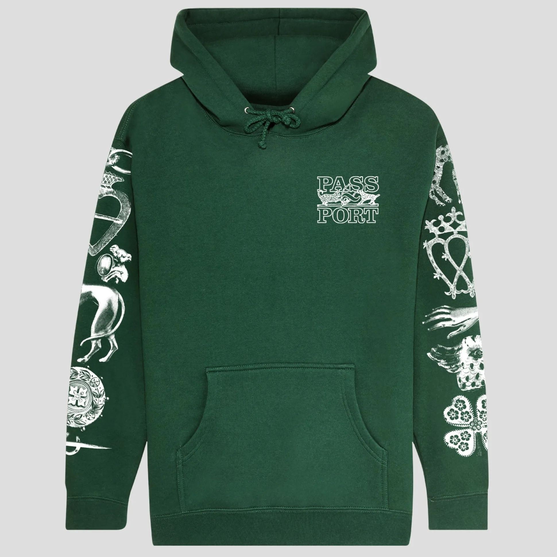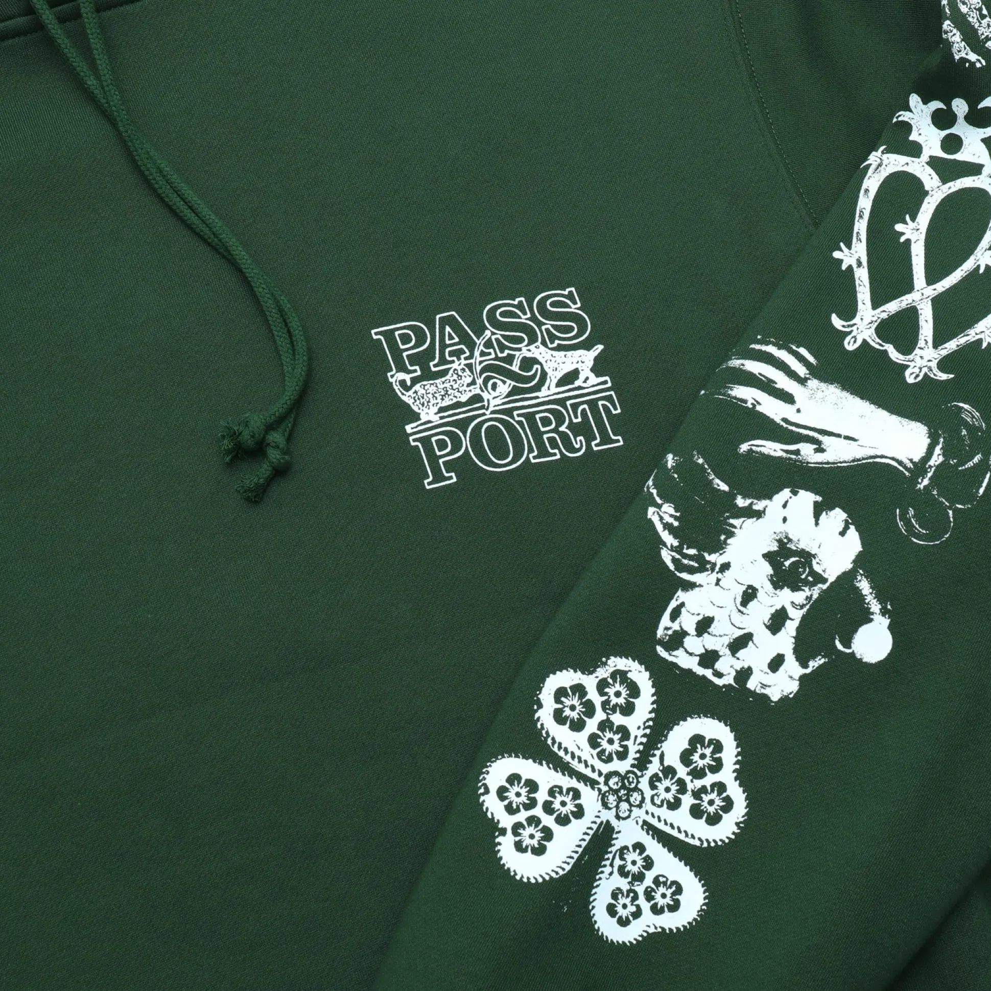Pass~Port Trinkets hood in forest green from range #39. Screen print on the front and sleeves in the classic Pass~Port hoodie fit.