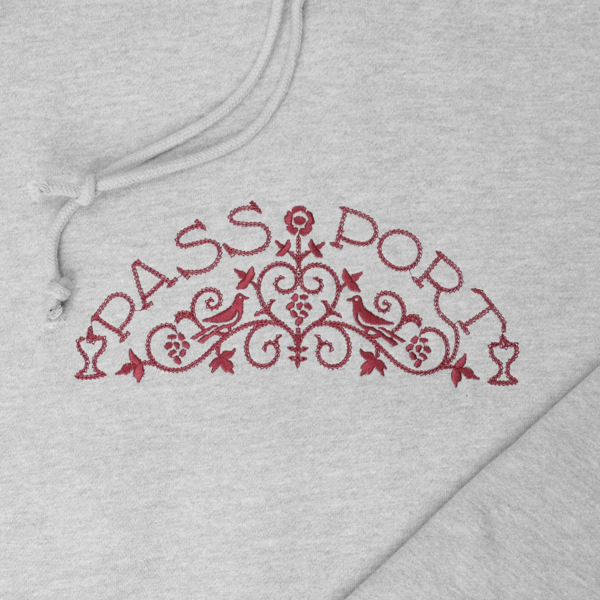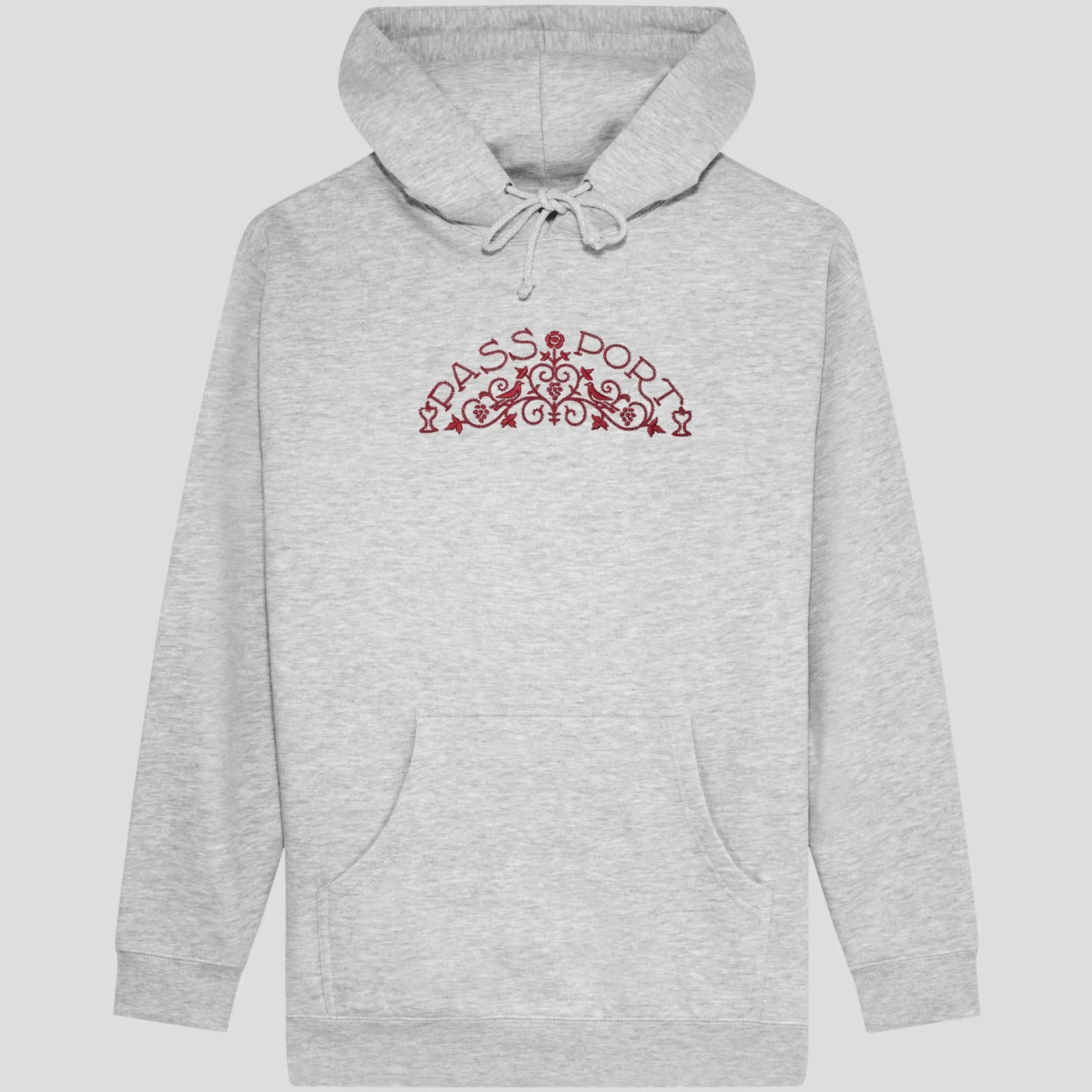 Pass~Port Vineyard Birds Hoodie in ash from range #42. The Pass~Port jumper is made from a cotton polyester blend and features direct chain stitch embroidery on front which is finished in the classic Pass~Port hood fit.