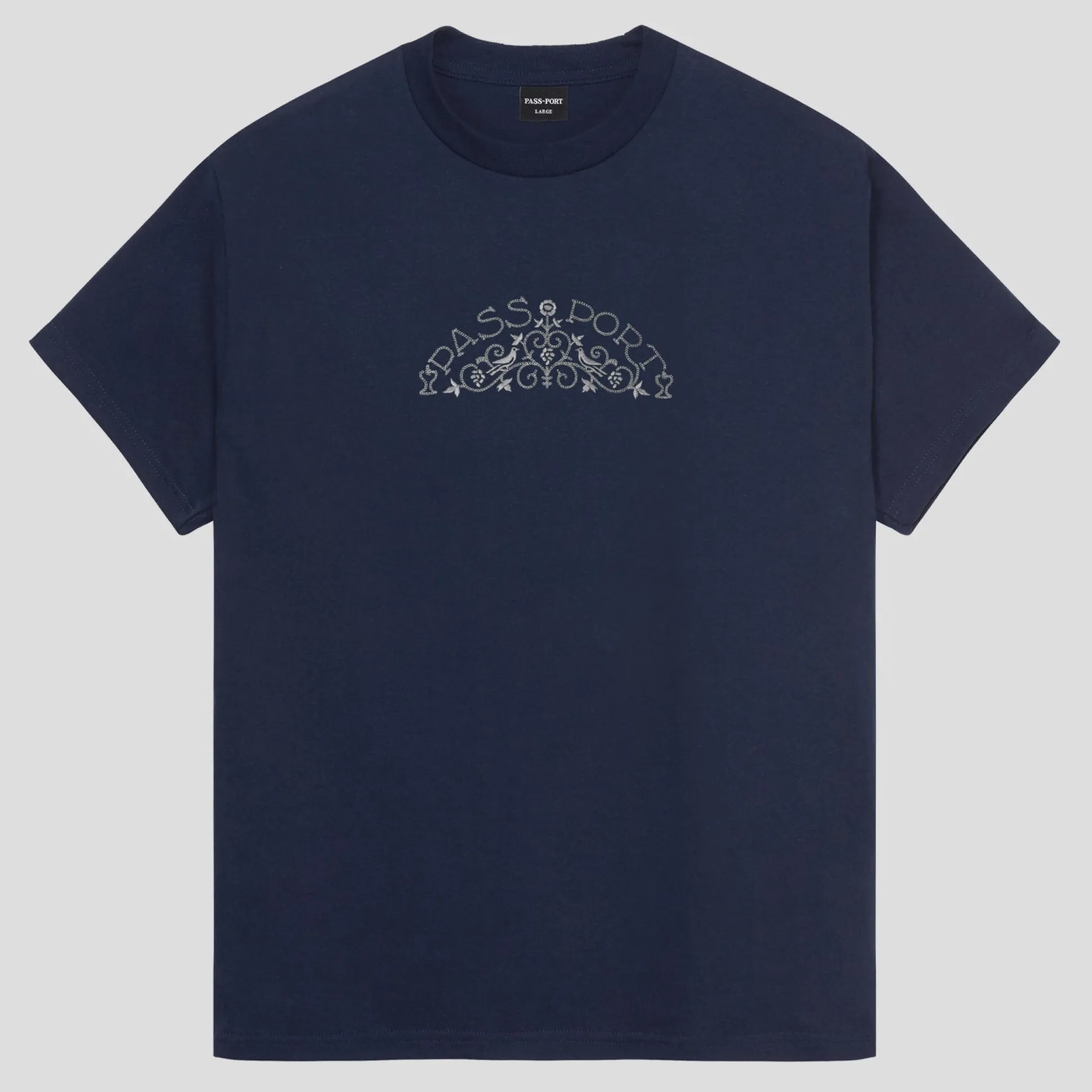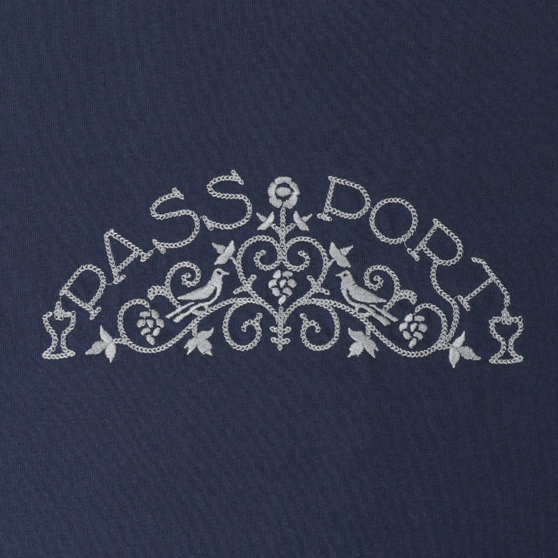 Pass~Port Vineyard Birds tee in navy from range #42. The Pass~Port t-shirt is made from 100% cotton and features chain stitch embroidery on front in the classic Pass~Port tee fit.