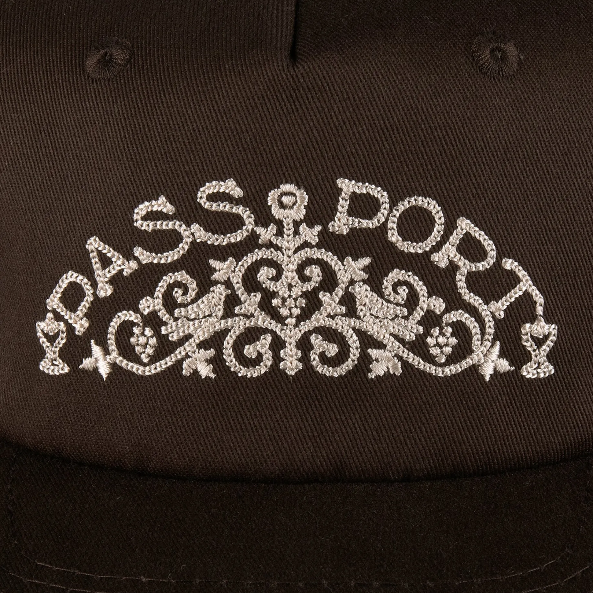 Pass~Port Vineyard Birds Workers cap in chocolate from range #42. The Pass~Port hat is a 5 panel construction made from 100% cotton and features direct chain stitch embroidery on front with snapback adjustment.