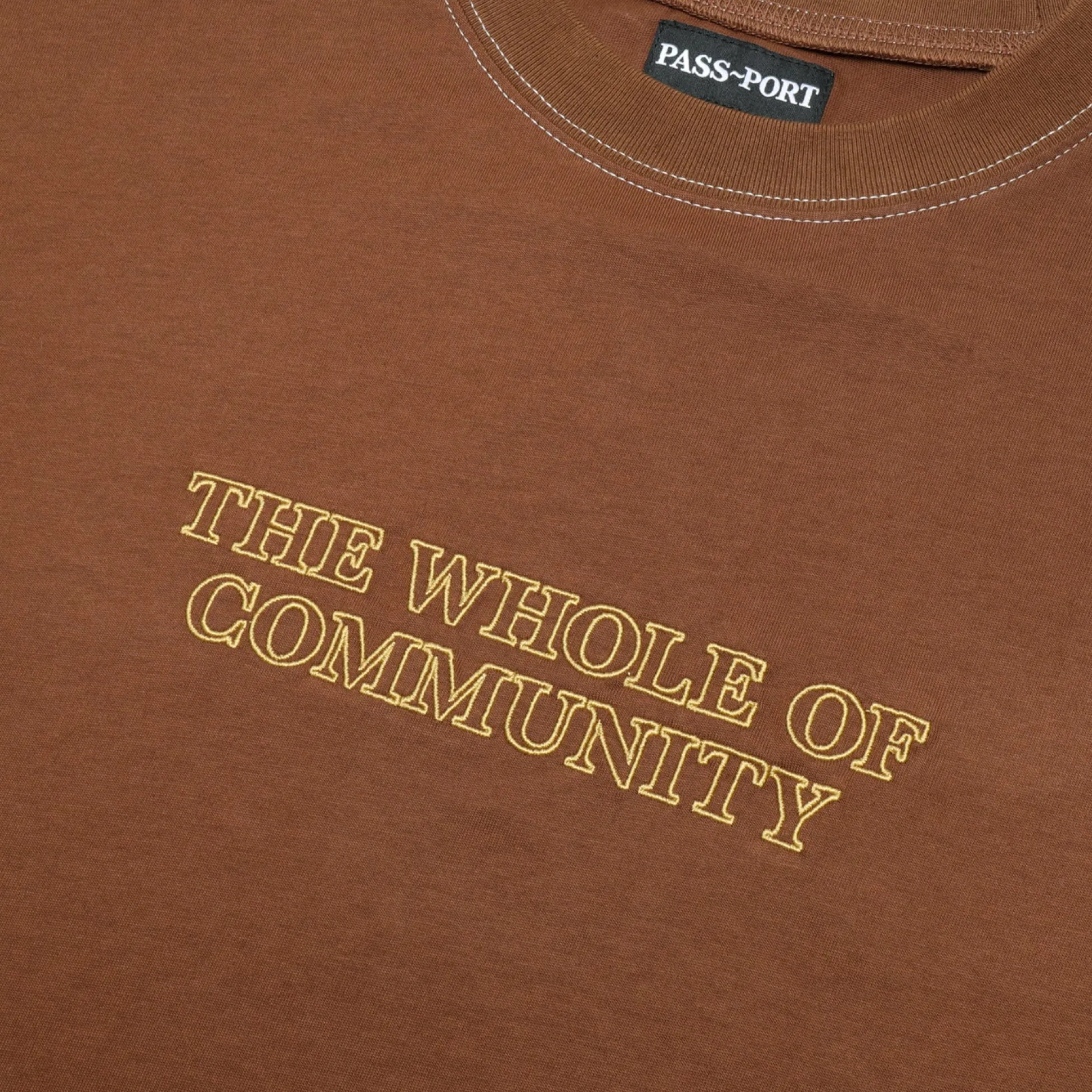 Pass~Port Whole of Community organic embroidery organic t-shirt in bark from range #38. Made from 100% organic grown cotton with contrast stitching and embroidery on front.