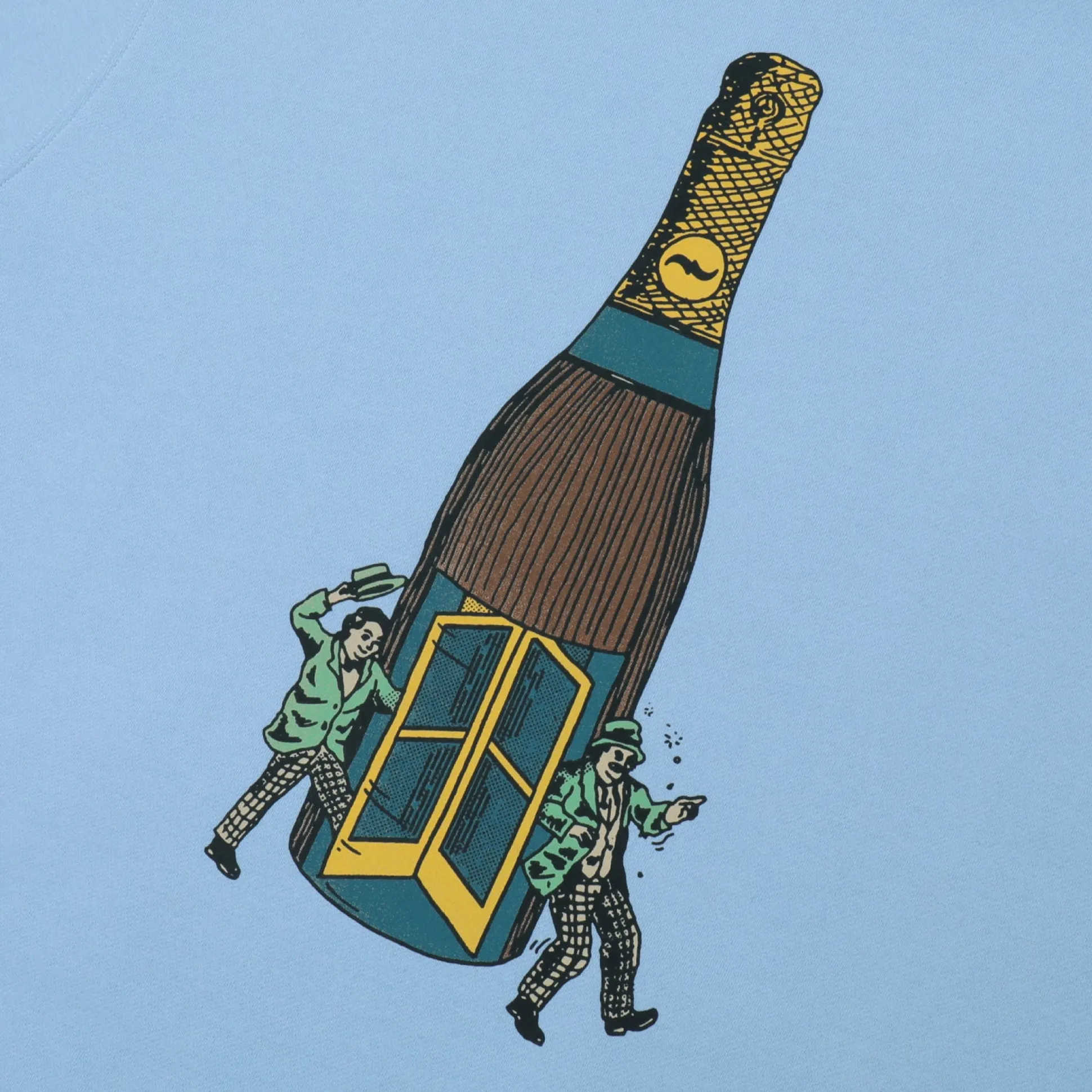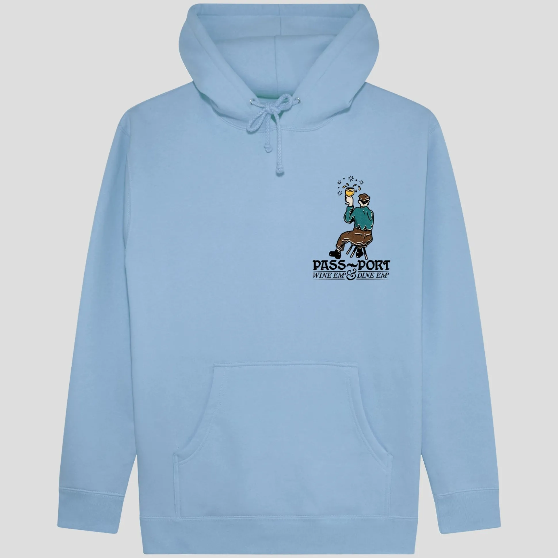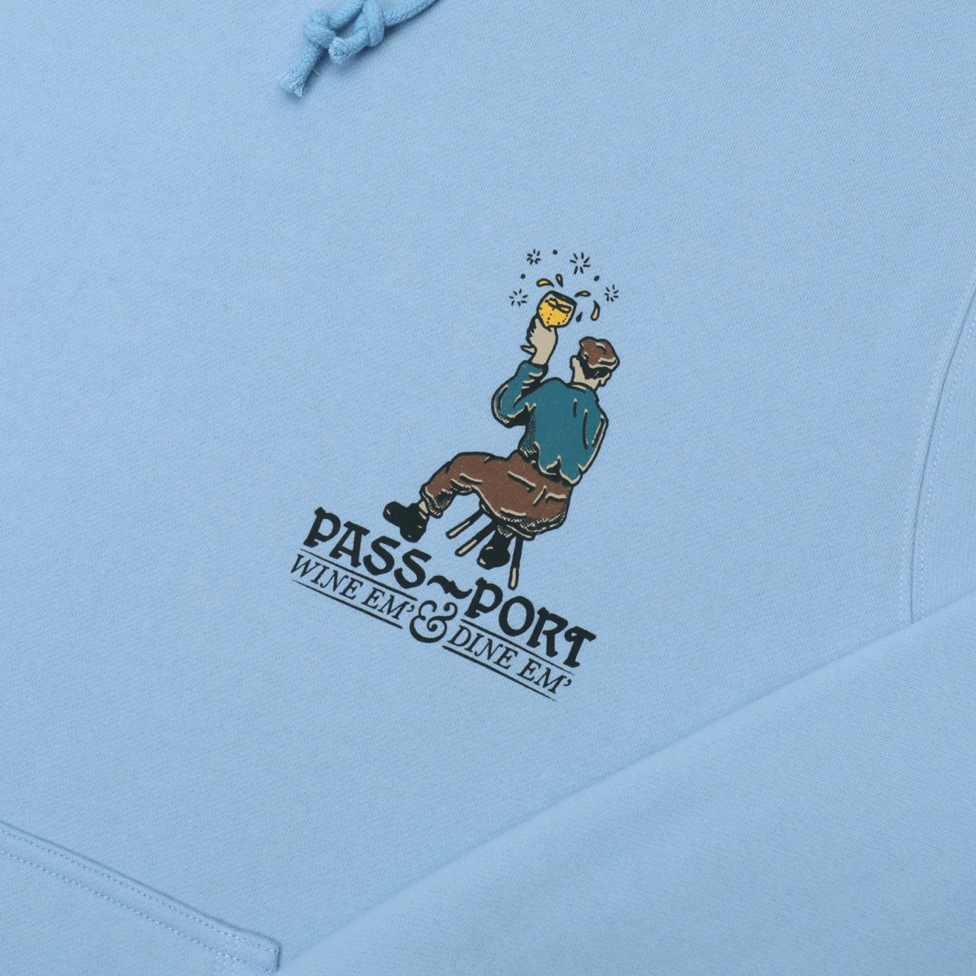 Pass~Port Wine Em’ Hoodie in light blue from range #42. The Pass~Port jumper is made from a cotton polyester blend and features screen print on front & back which is finished in the classic Pass~Port hood fit.