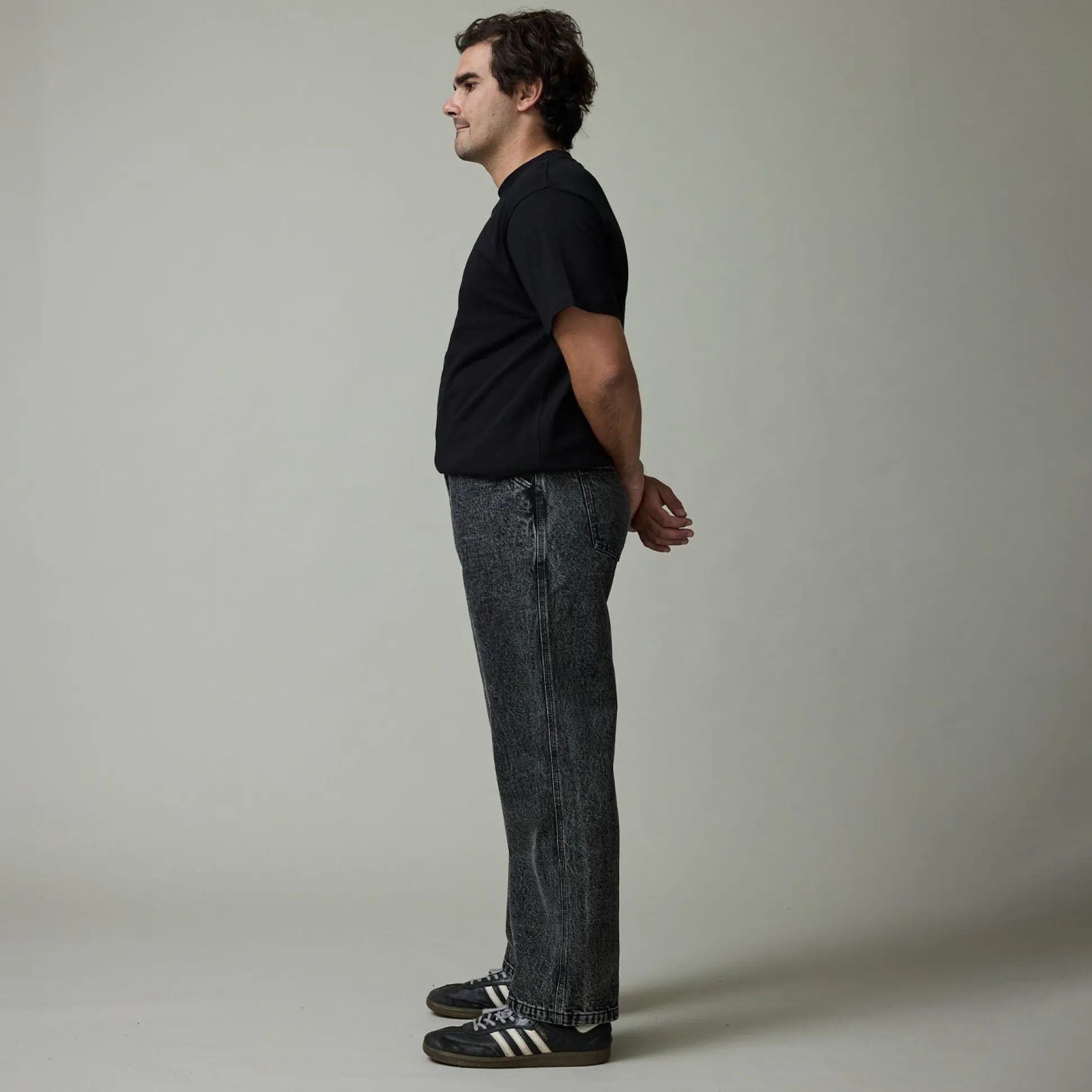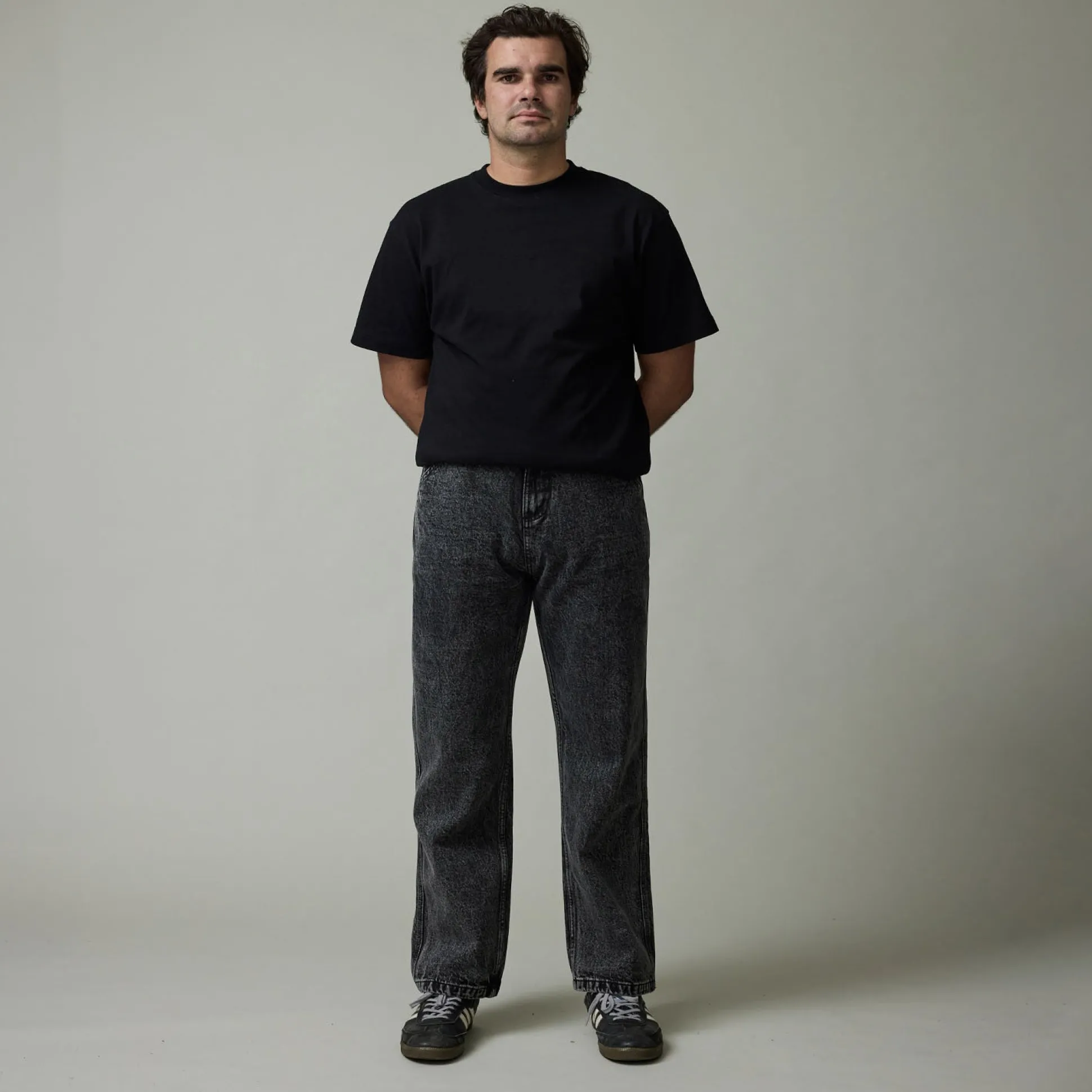 Pass~Port Workers Club denim jean in dark grey over-dye from range #42. The Workers denim pant is made from 100% cotton 16oz rigid denim and fine yarn for extra strength. The denim jean features over-dyed denim, digger embroidery on back pocket as well a faux leather label on waist.