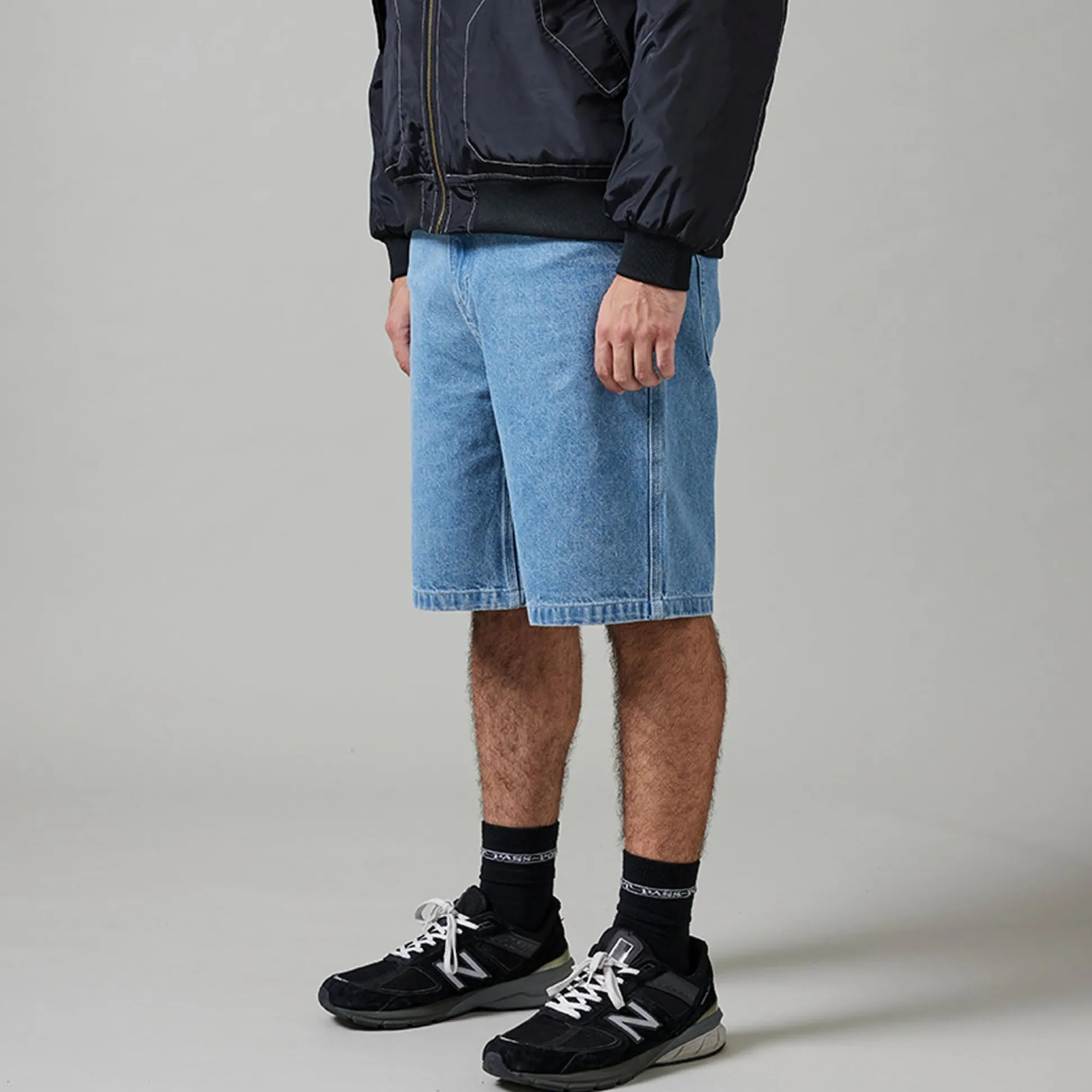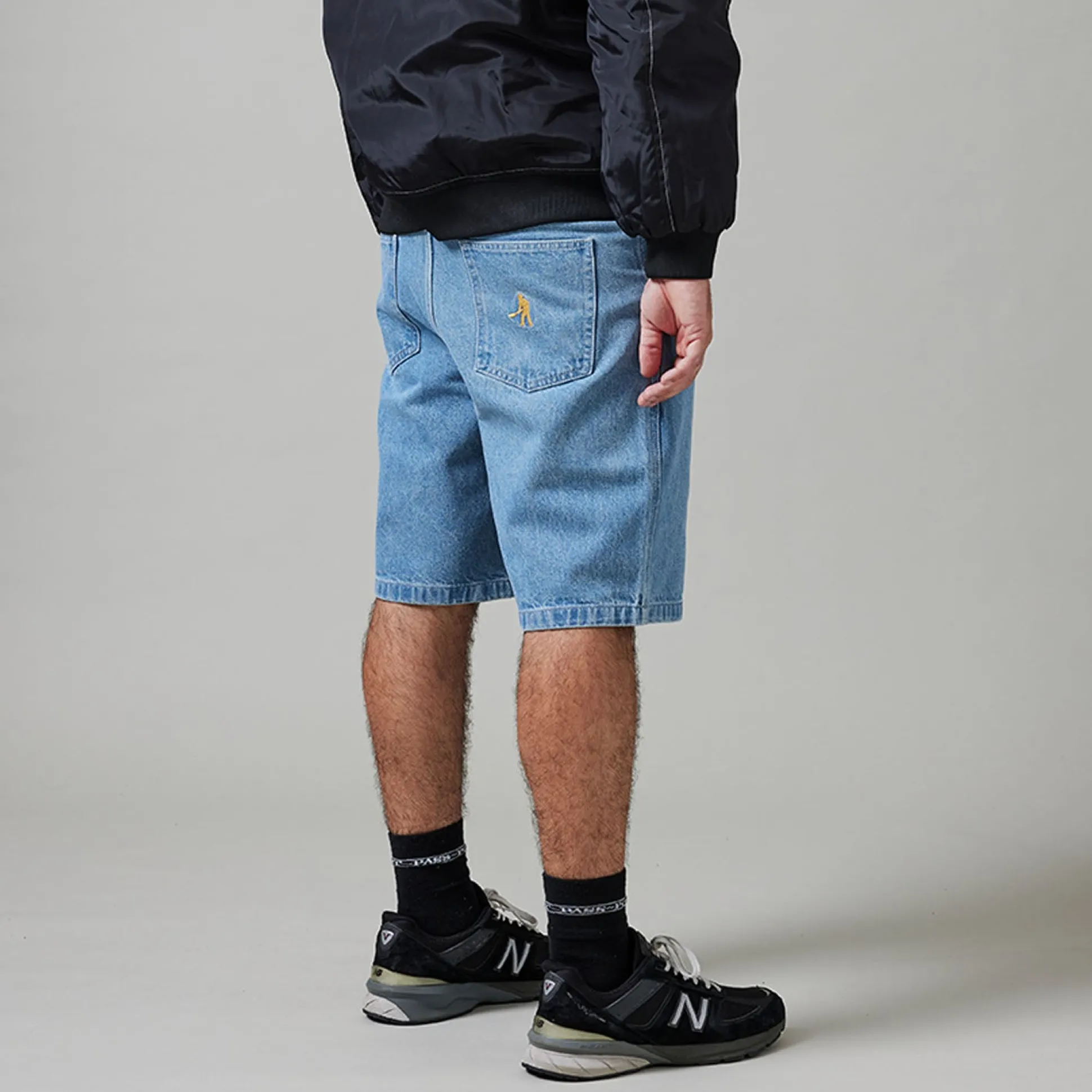 Pass~Port Workers Club denim short in washed light indigo from range #44. The Workers denim short is made from 100% cotton 16oz rigid denim and fine yarn for extra strength. The jort features silver contrast stitching, digger embroidery on back pocket as well a faux leather label on waist.