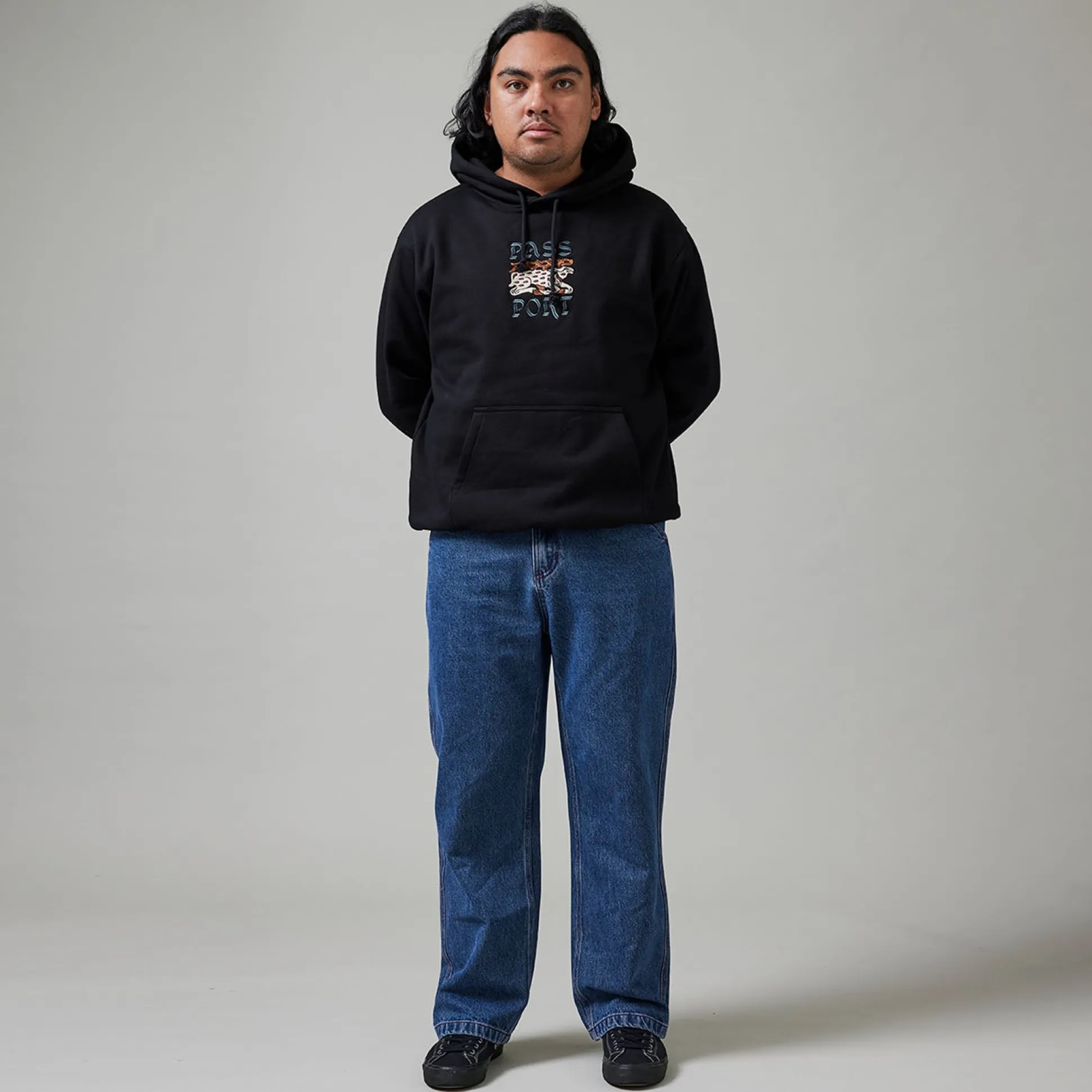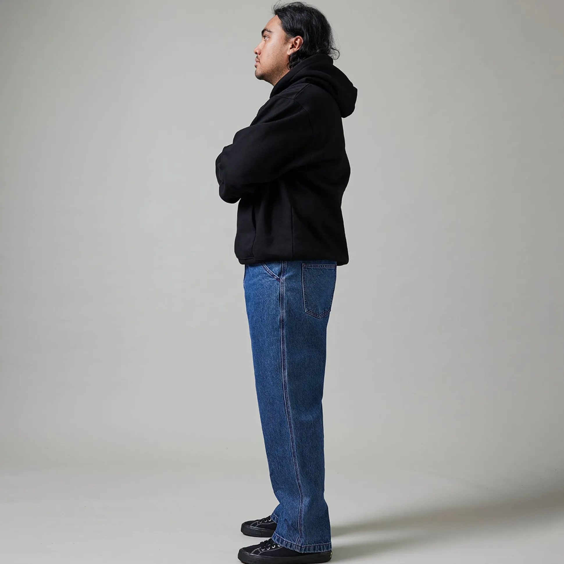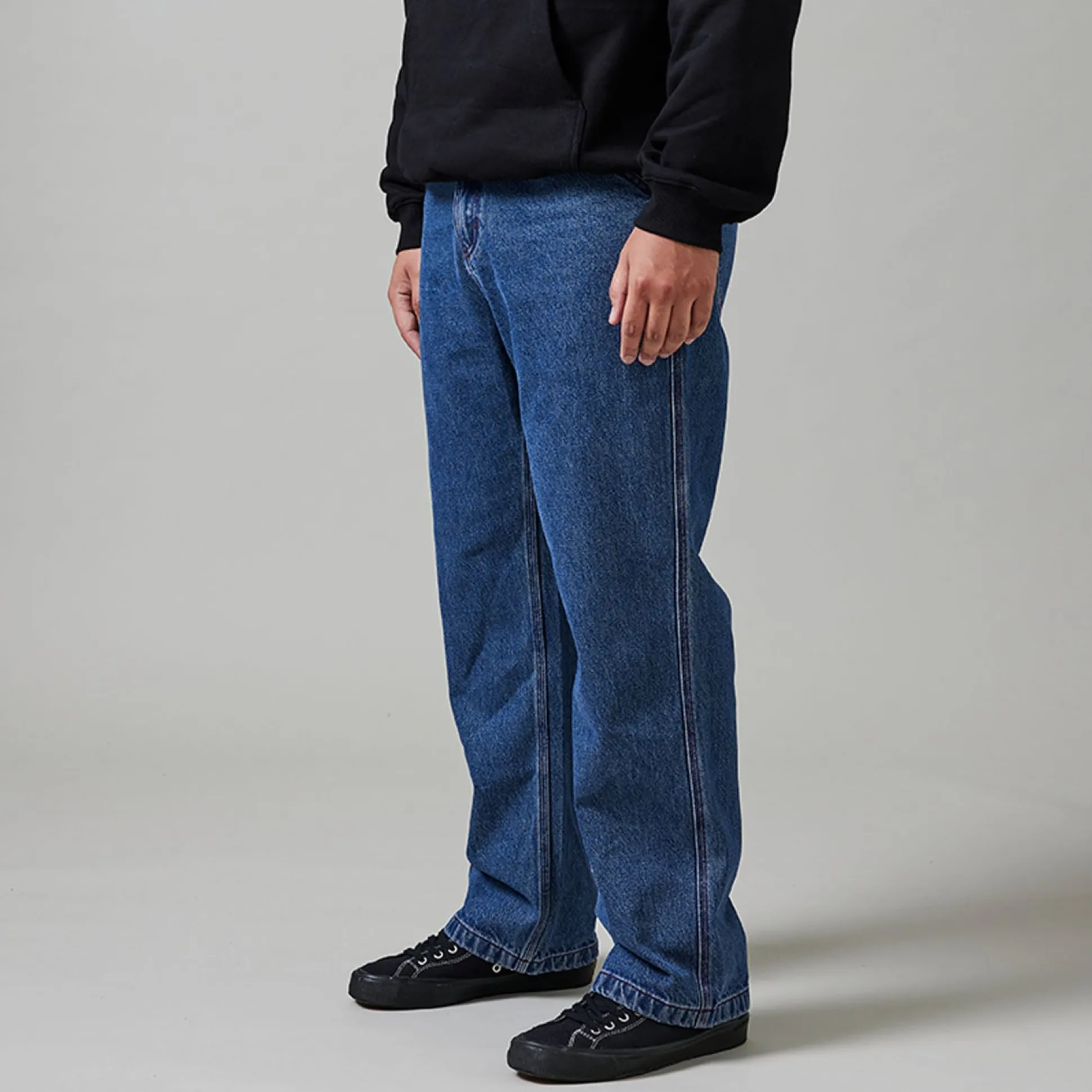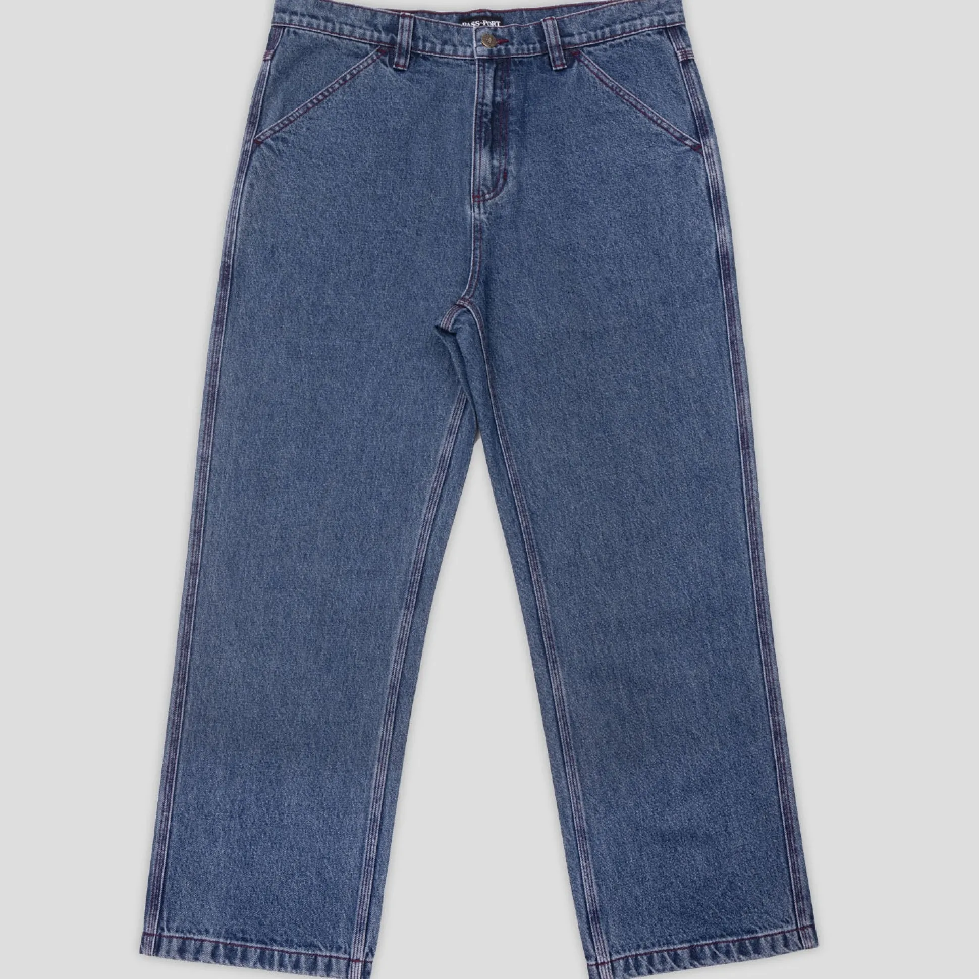 Pass~Port Workers Club denim jean in washed light indigo from range #41. The Workers denim pant is made from 100% cotton 16oz rigid denim and fine yarn for extra strength. The denim jean features maroon contrast stitching, digger embroidery on back pocket as well a faux leather label on waist.