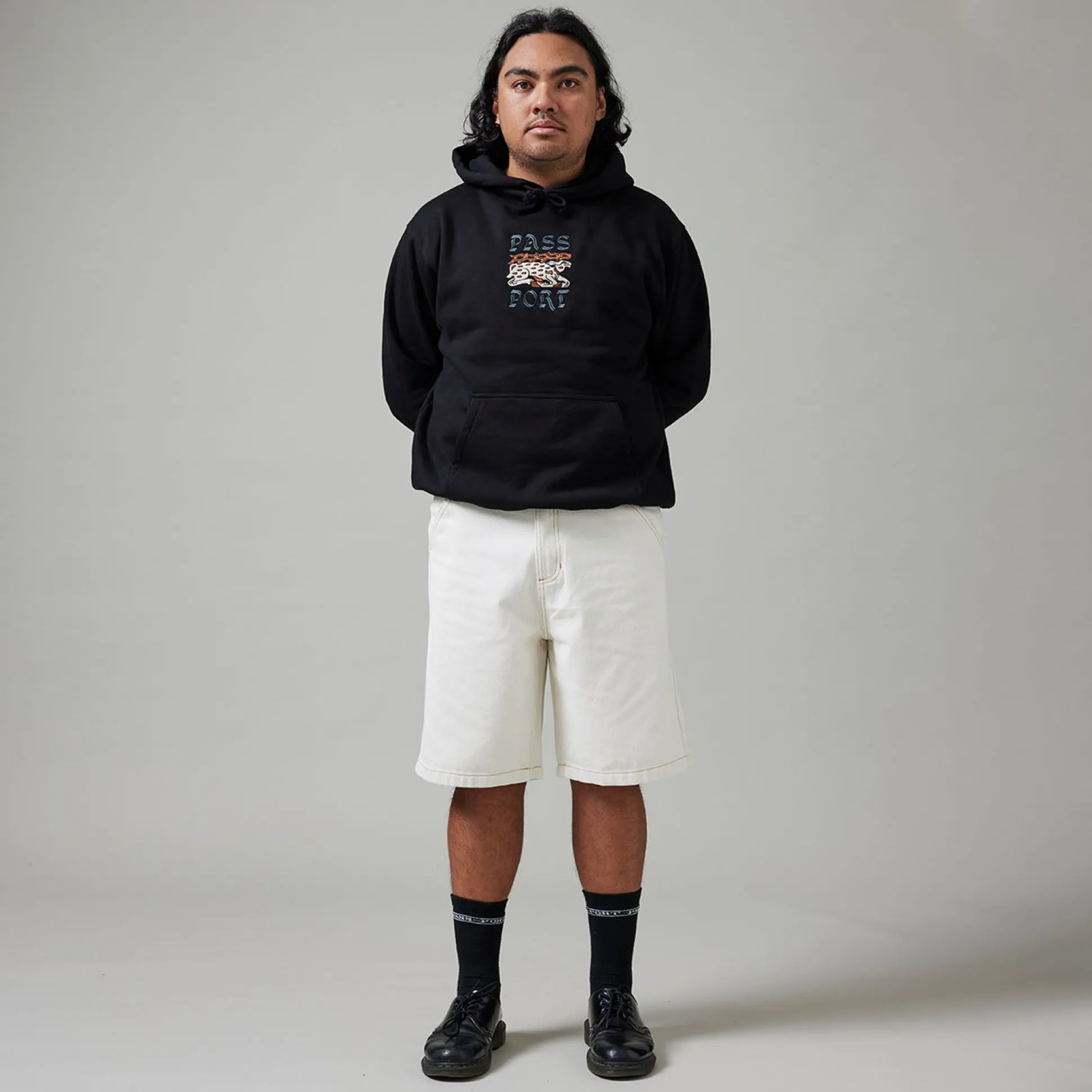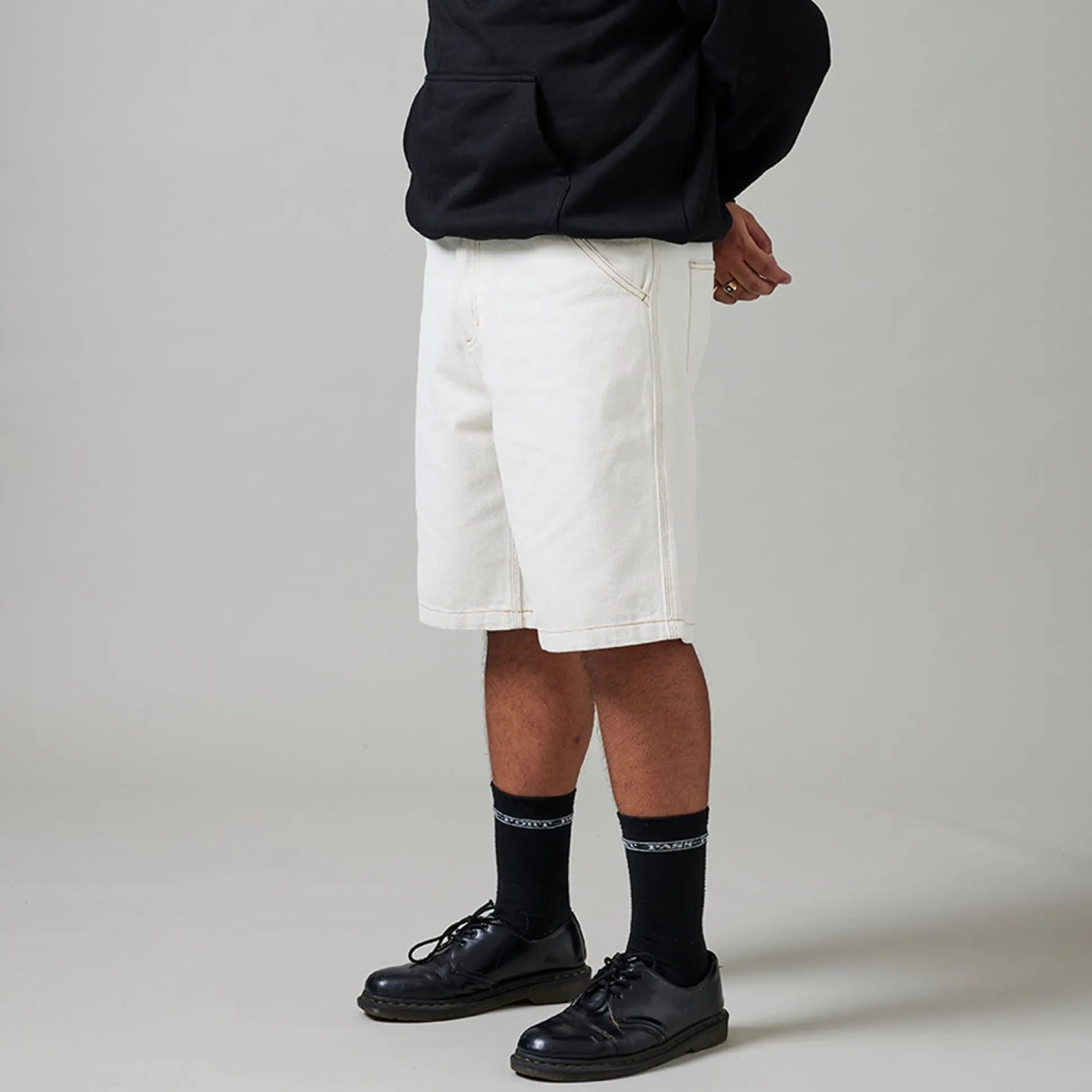 Pass~Port Workers Club denim short in Ecru from range #41. This denim short is made from 100% cotton 16oz rigid denim and fine yarn for extra strength. The denim jort features digger embroidery on back pocket as well a faux leather label on waist.