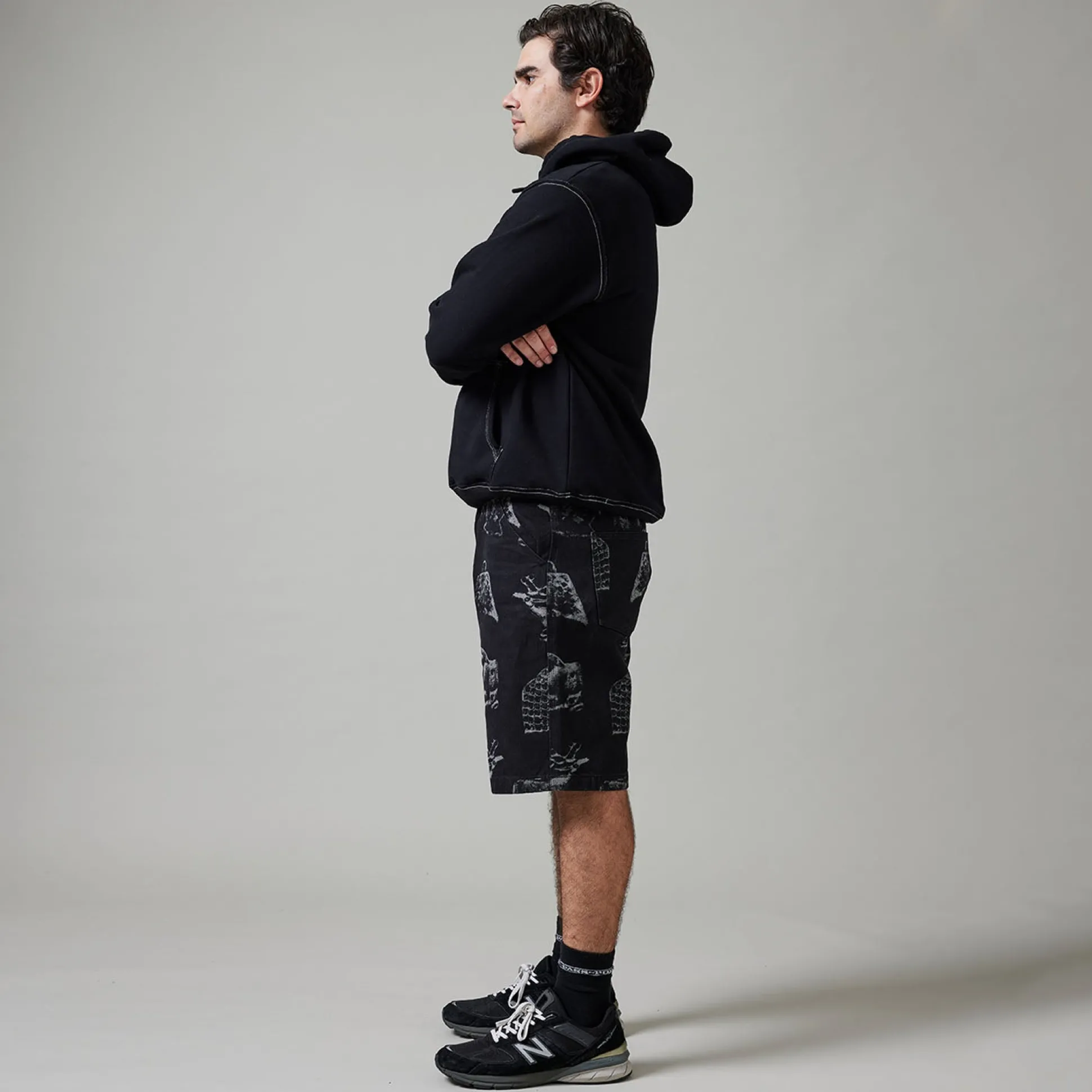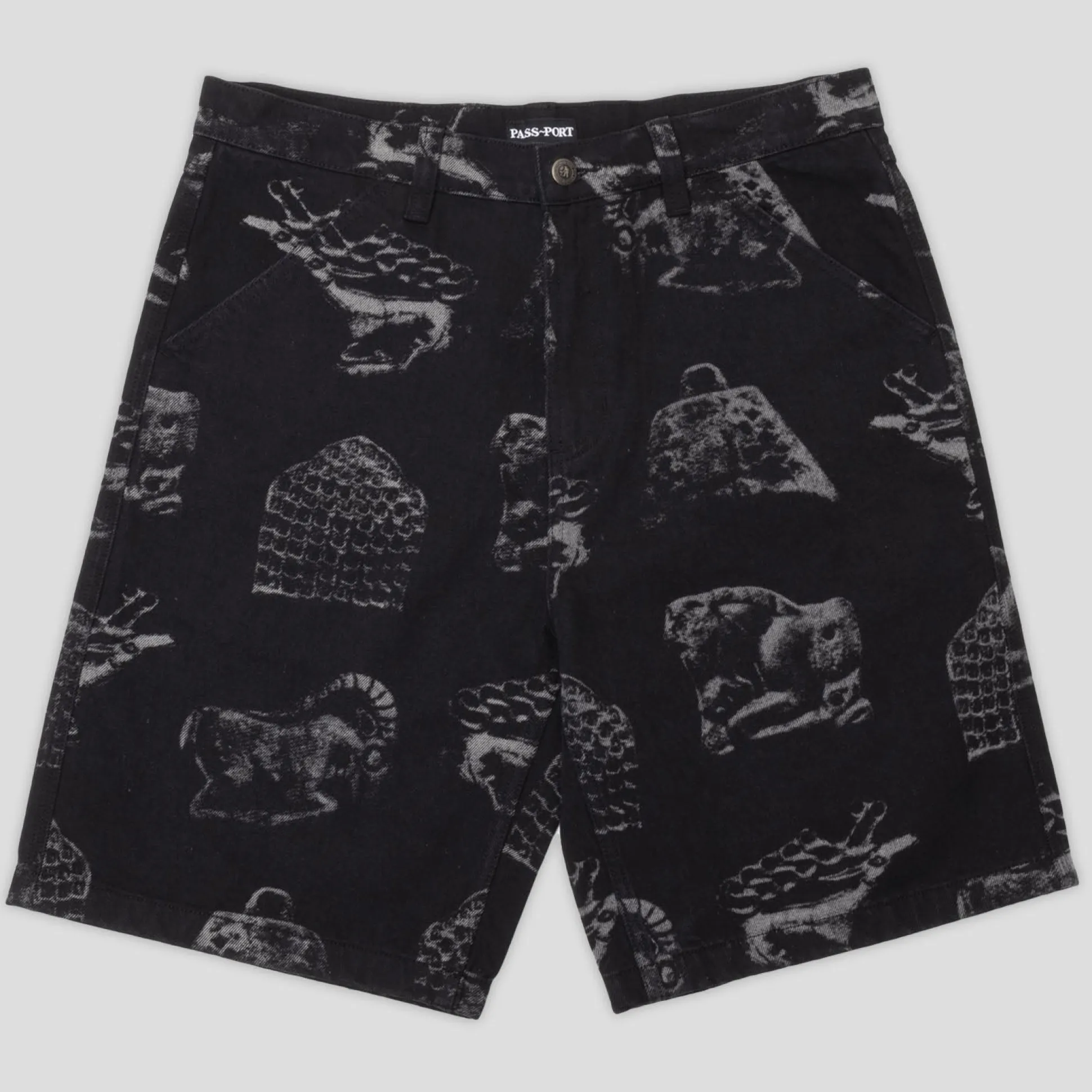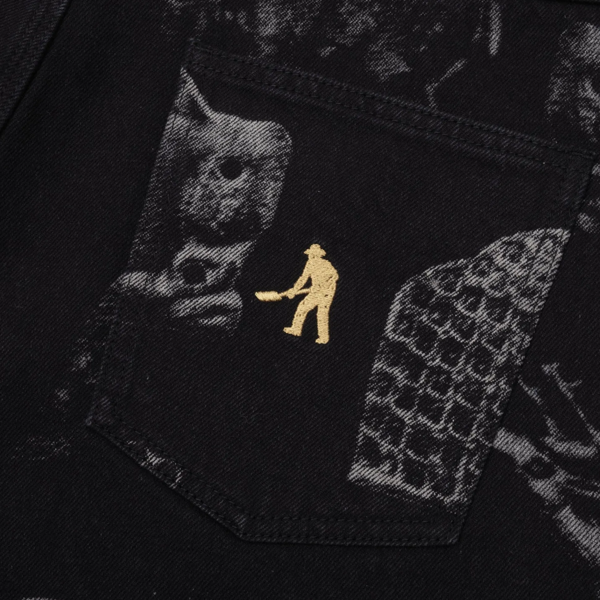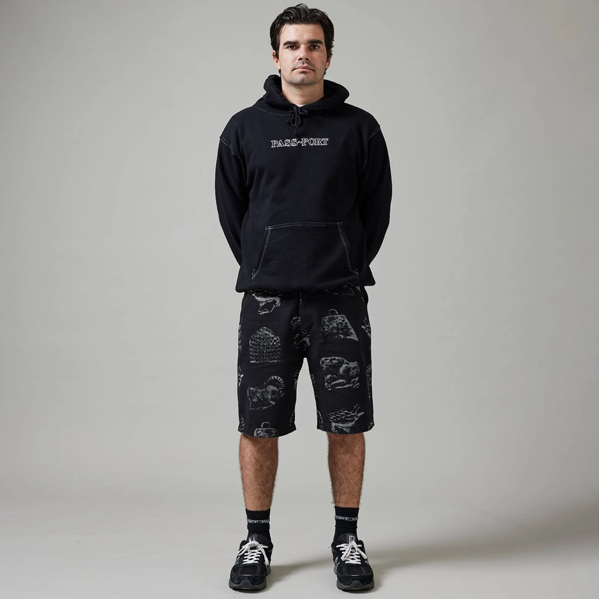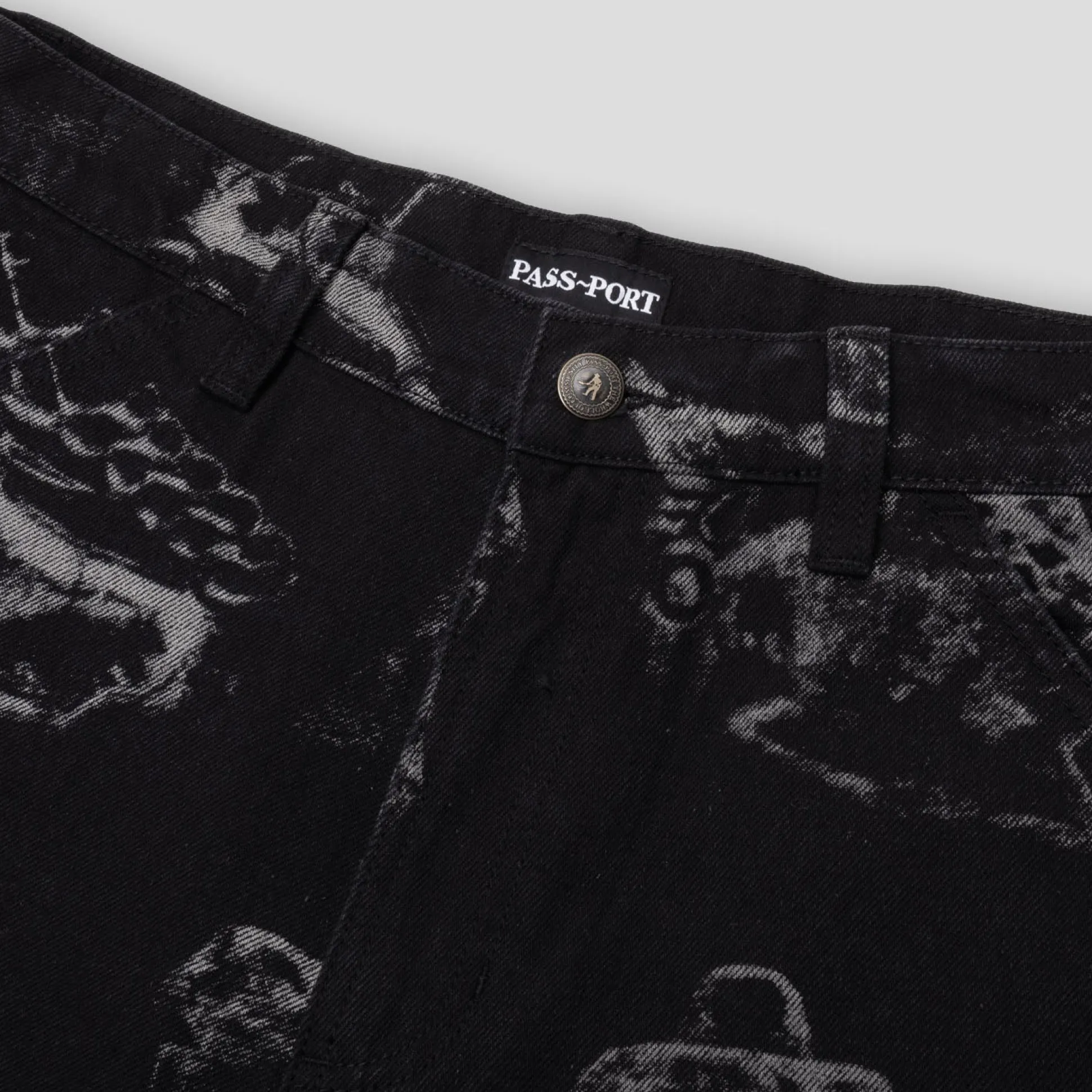 Pass~Port Workers Club denim short in trinkets laser etched black from range #41. This denim short is made from 100% cotton 16oz rigid denim and fine yarn for extra strength. The denim jort features laser etched trinkets and digger embroidery on back pocket as well a faux leather label on waist.