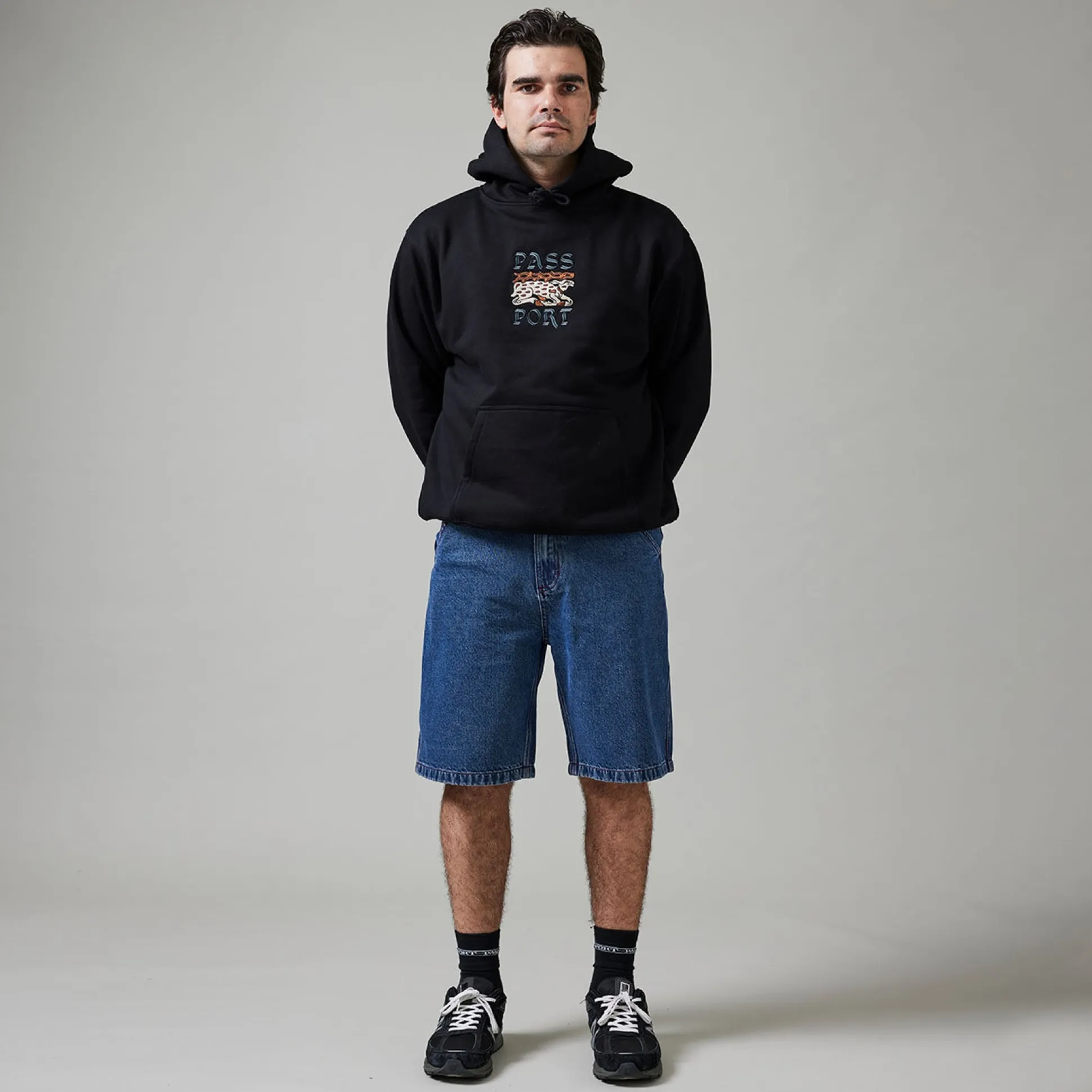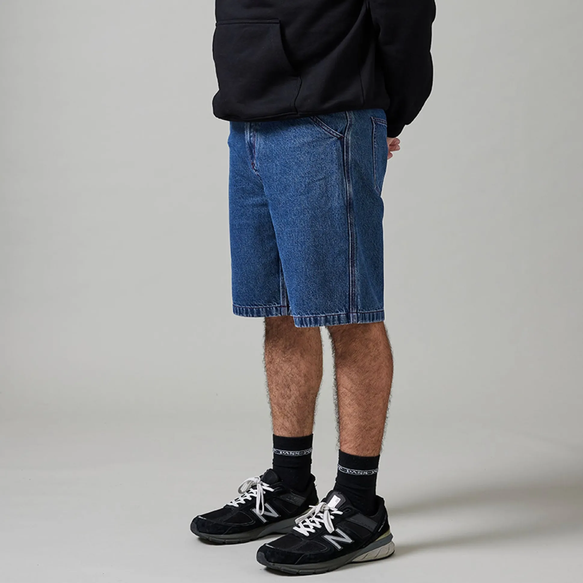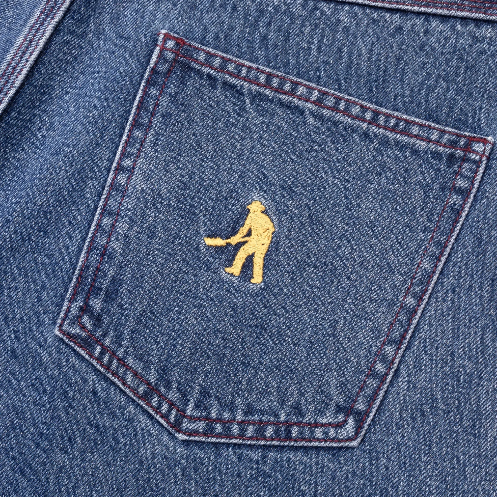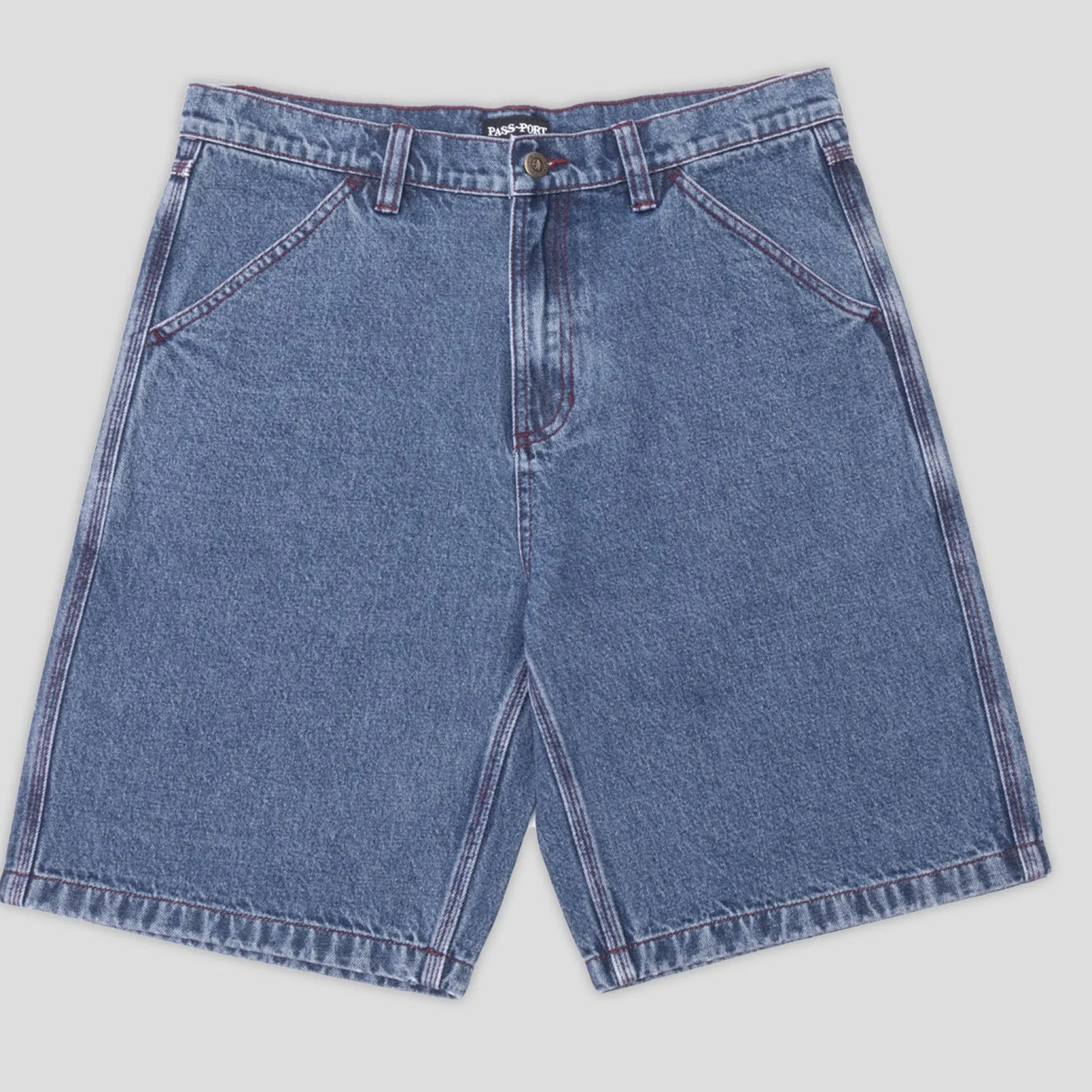 Pass~Port Workers Club denim short in washed dark indigo from range #41. The Workers denim short is made from 100% cotton 16oz rigid denim and fine yarn for extra strength. The jort features maroon contrast stitching, digger embroidery on back pocket as well a faux leather label on waist.