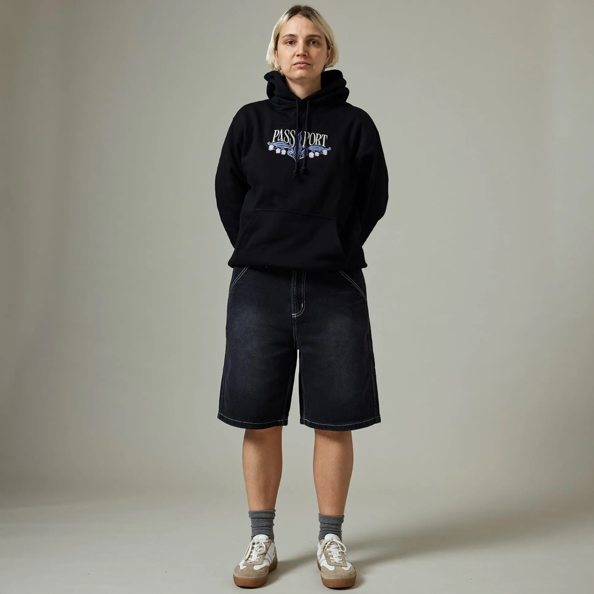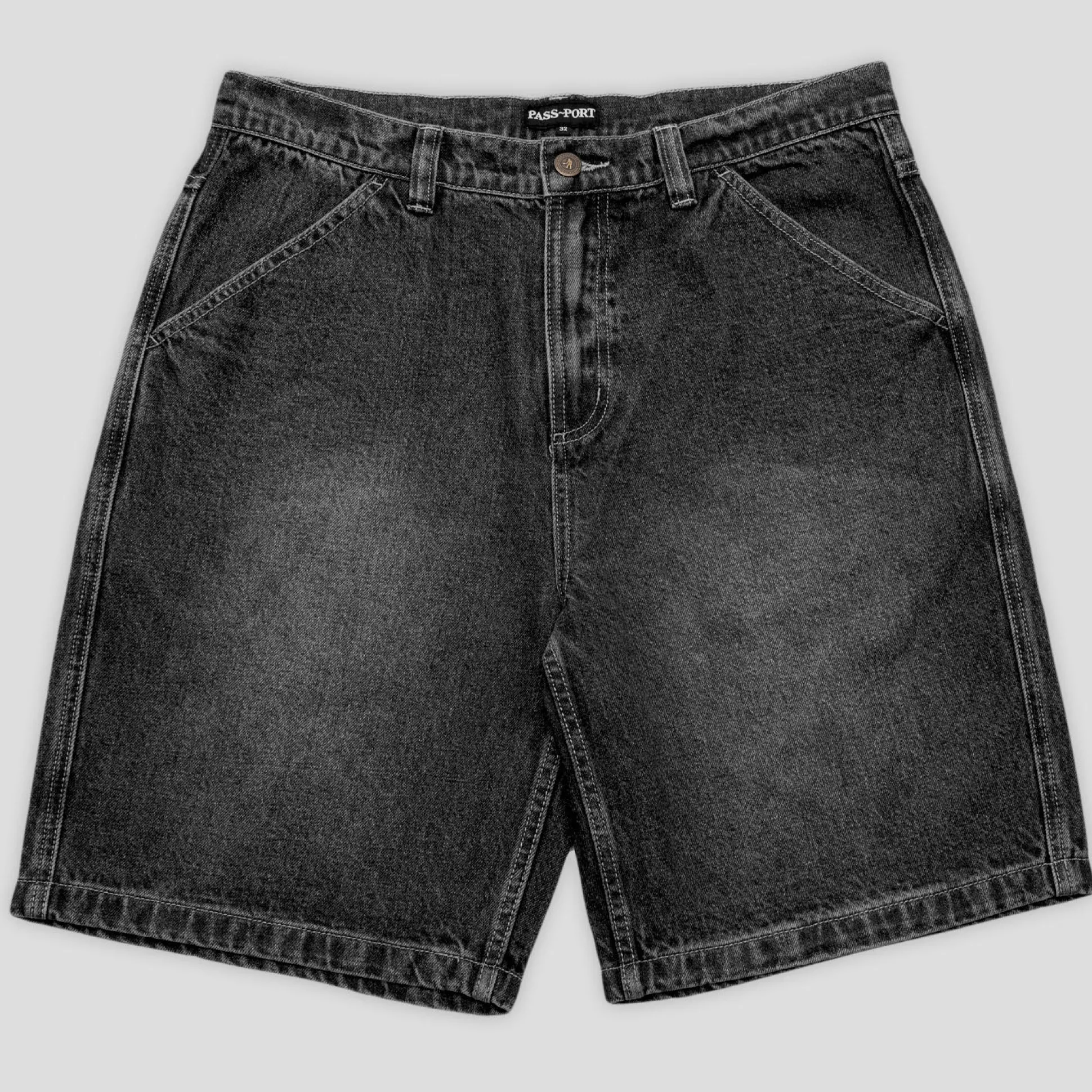 Pass~Port Workers Club denim short from range #43. The Workers denim shorts is made from 100% cotton 16oz rigid denim and fine yarn for extra strength. The denim jean features silver contrast stitching, digger embroidery on back pocket as well a faux leather label on waist.