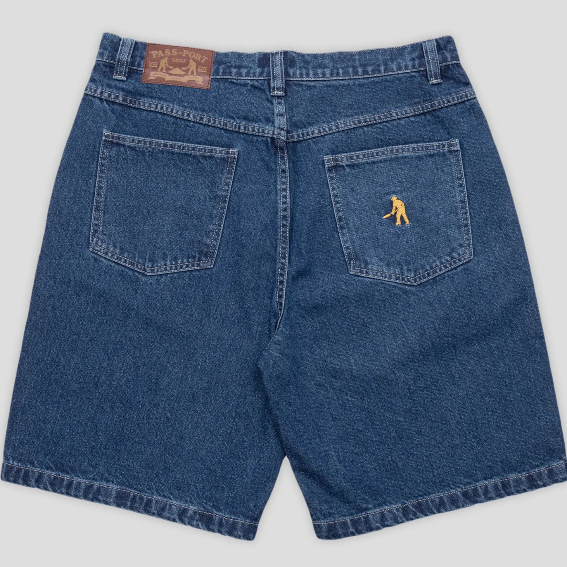 Pass~Port Workers Club denim short from range #44. The Workers denim shorts is made from 100% cotton 16oz rigid denim and fine yarn for extra strength. The denim jean features silver contrast stitching, digger embroidery on back pocket as well a faux leather label on waist.