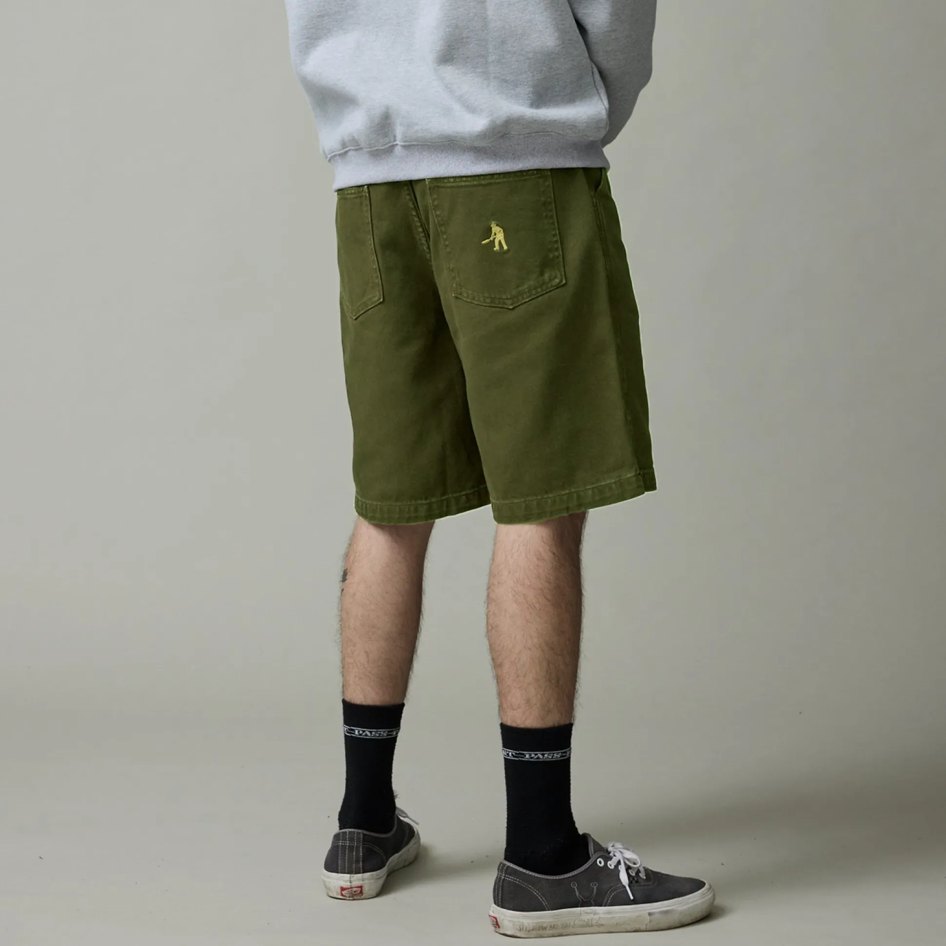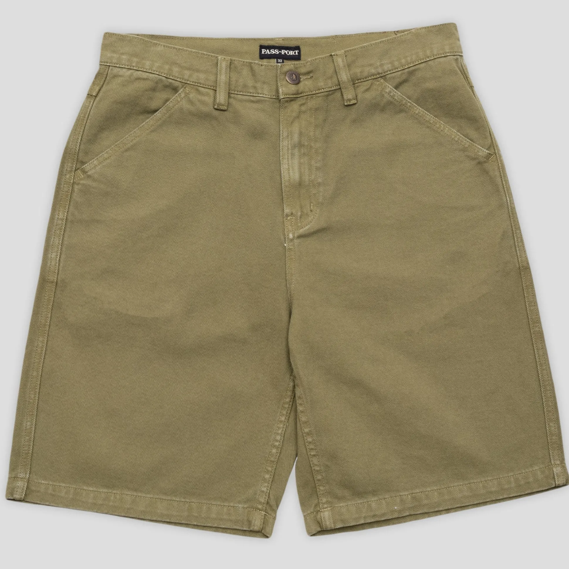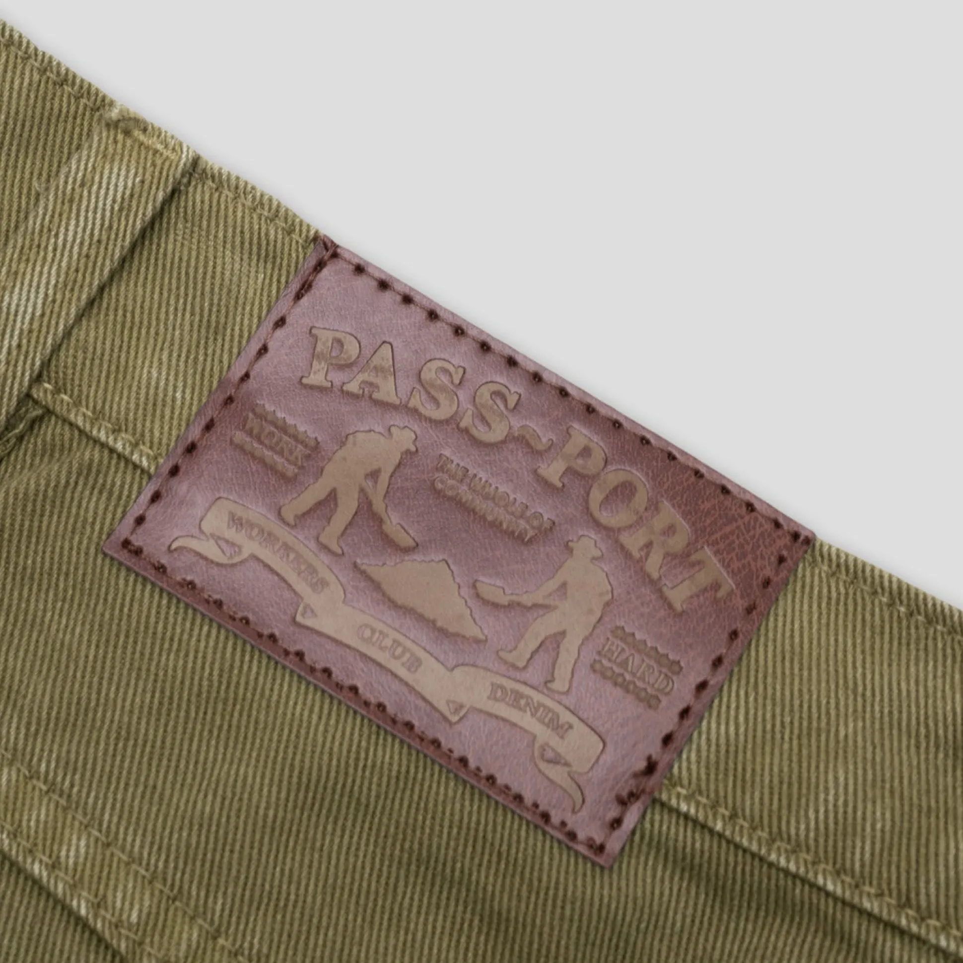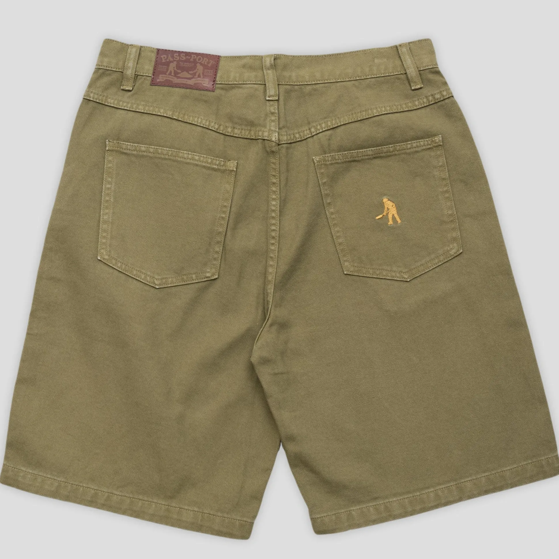 Pass~Port Workers Club denim short from range #43. The Workers denim shorts is made from 100% cotton 16oz rigid denim and fine yarn for extra strength. The denim jean features silver contrast stitching, digger embroidery on back pocket as well a faux leather label on waist.