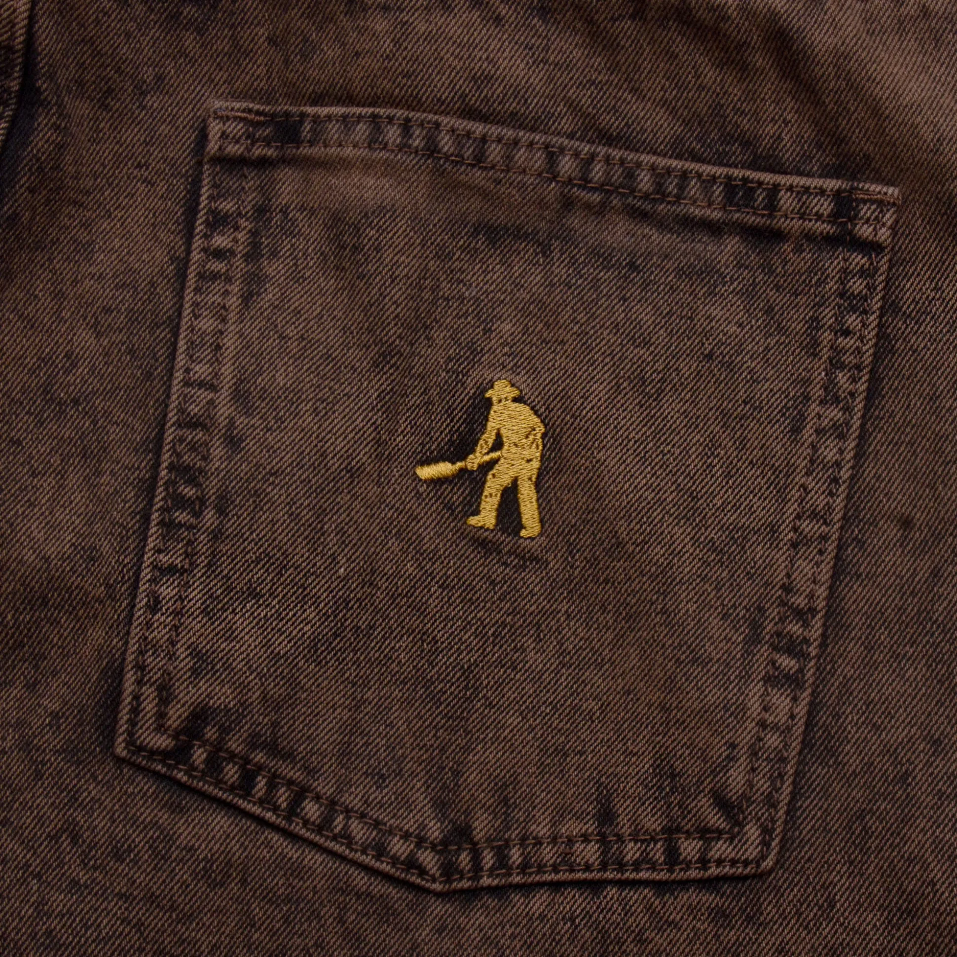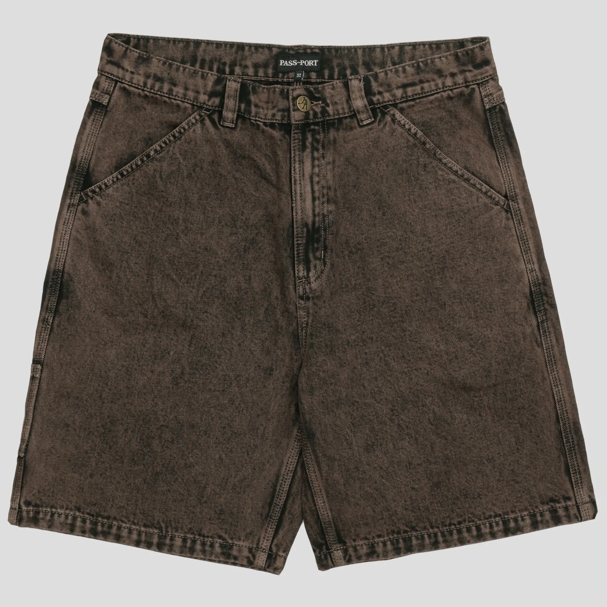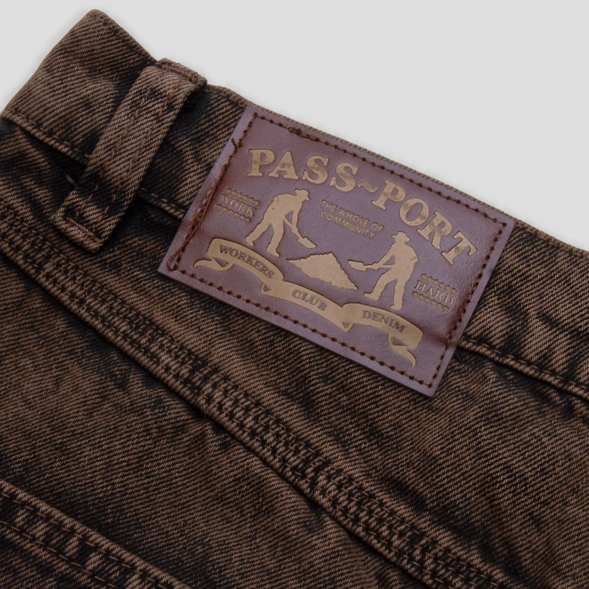 Pass~Port Workers Club denim short in brown over-dye from range #39. Made from 100% Cotton 16oz Rigid Denim and fine yarn for extra strength. The denim jort features digger embroidery on back pocket as well a faux leather label on waist.