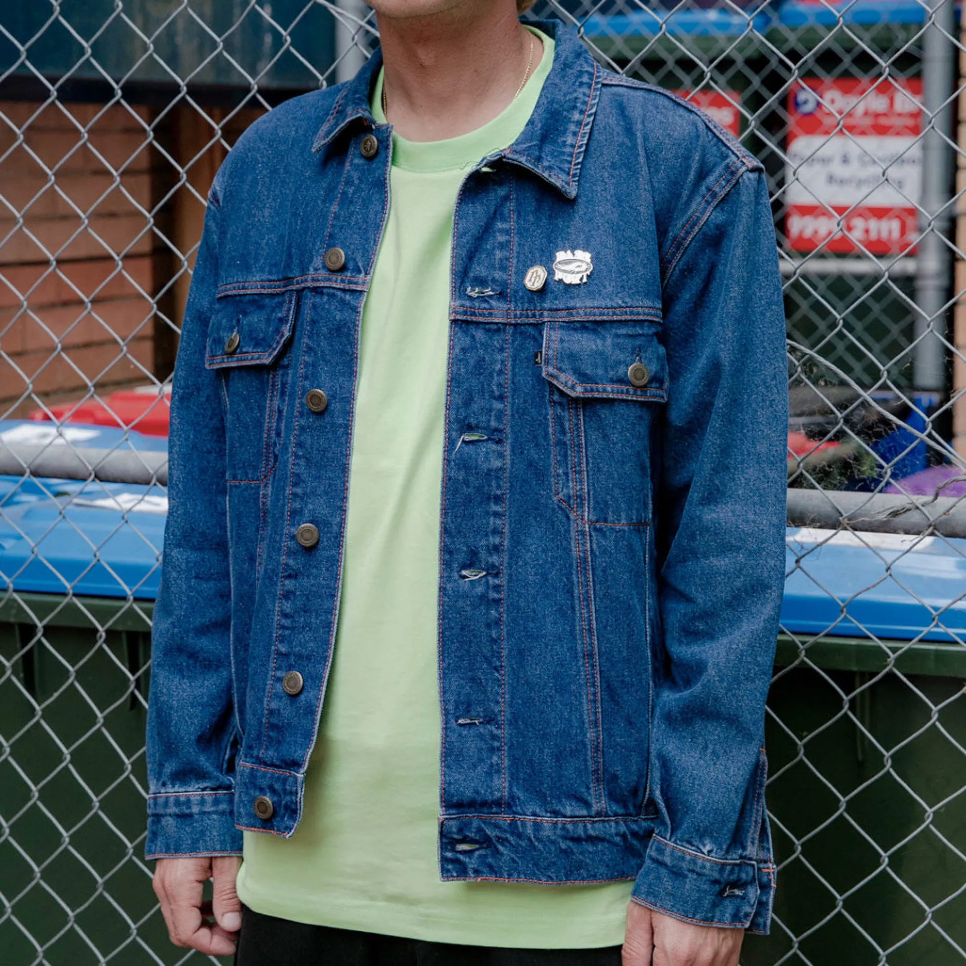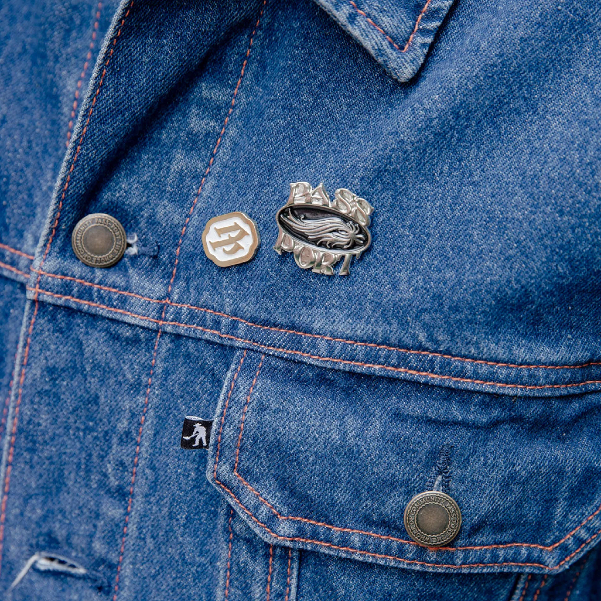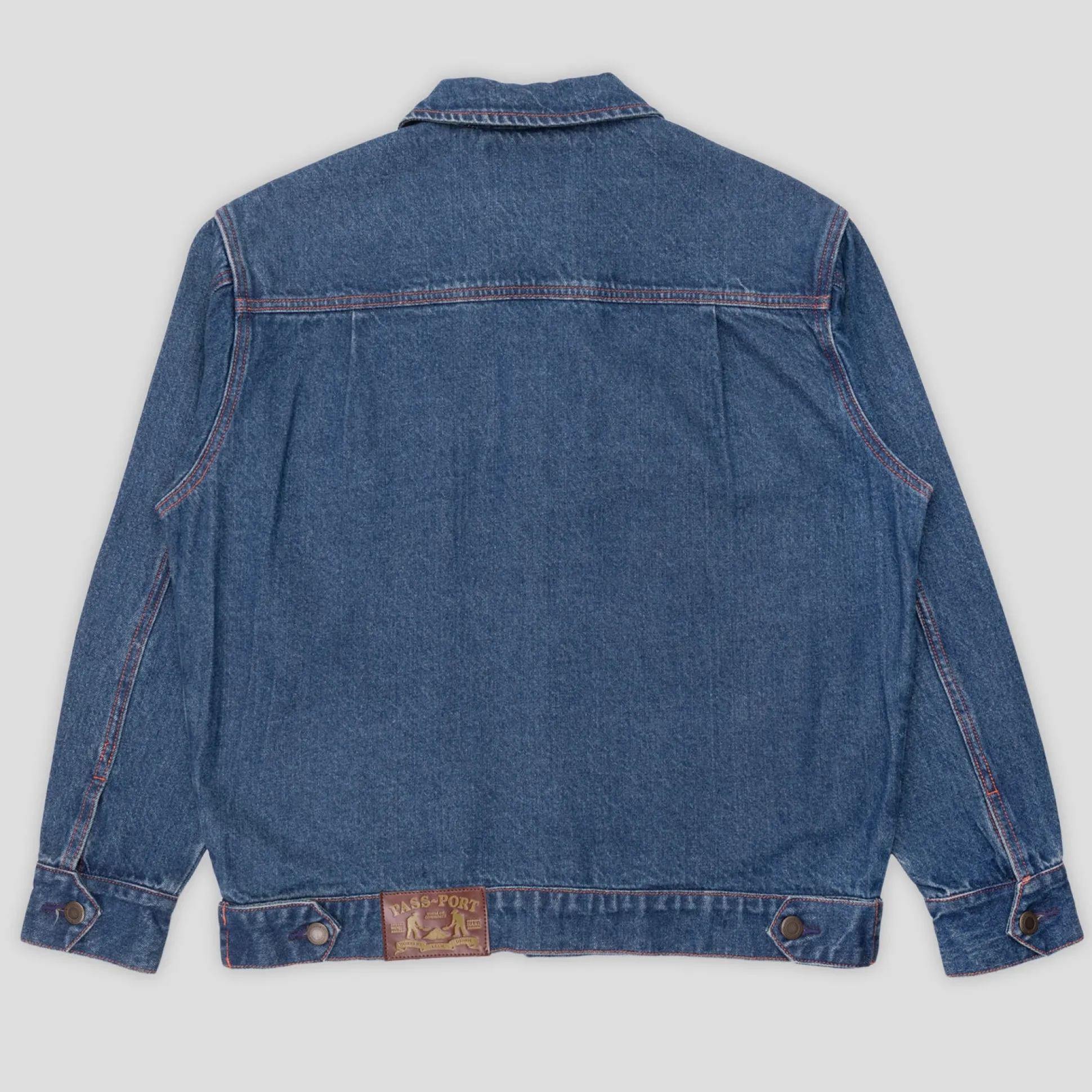 Pass~Port Workers Denim Trucker Jacket from range #44. The Pass~Port casual workwear jacket is made from 16 oz denim with contrast stitch detailing.