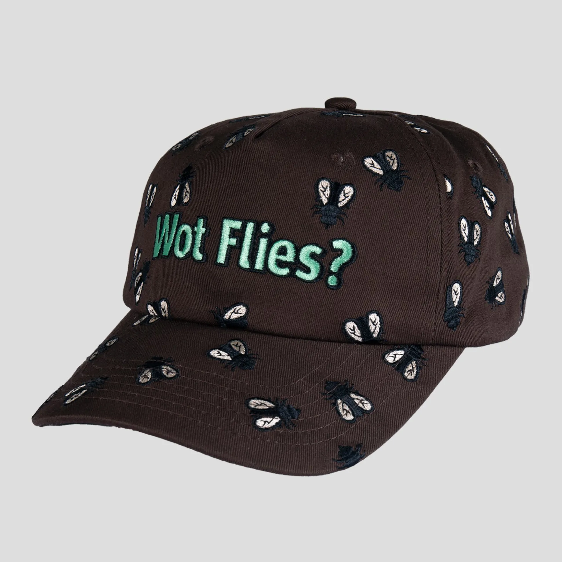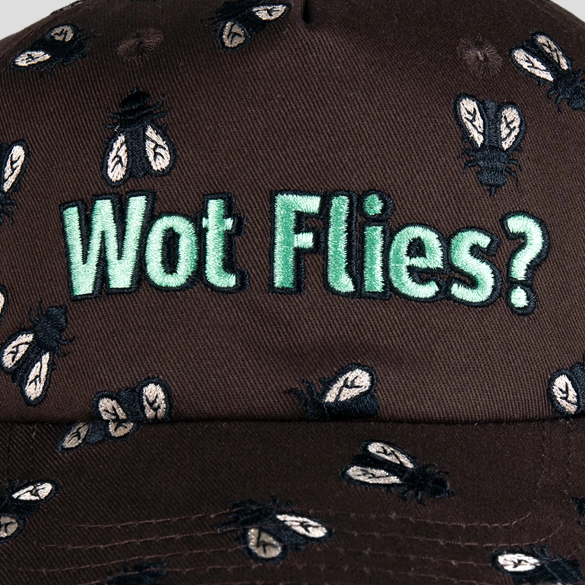 Pass~Port Wot Flies Packers cap in chocolate from range #42. The Pass~Port hat is a 5 panel construction made from 100% cotton and features all over direct embroidery with with brass clasp adjustment.