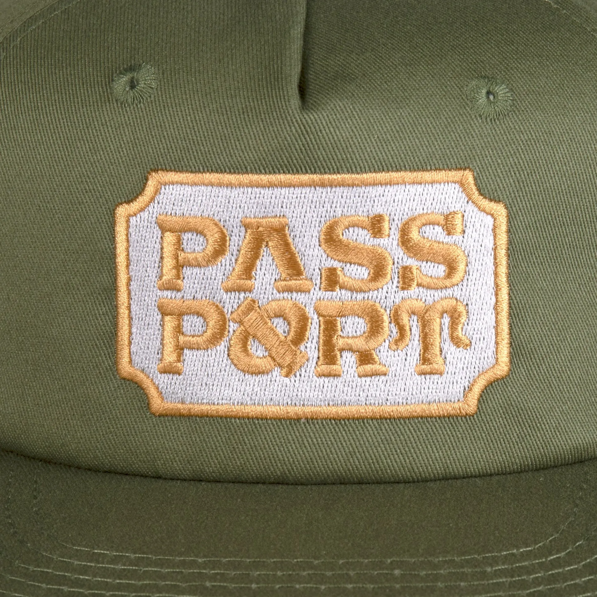 Pass~Port Yearbook Logo Workers cap in military from range #42. The Pass~Port hat is a 5 panel construction made from 100% cotton and features direct embroidery on front with snapback adjustment.