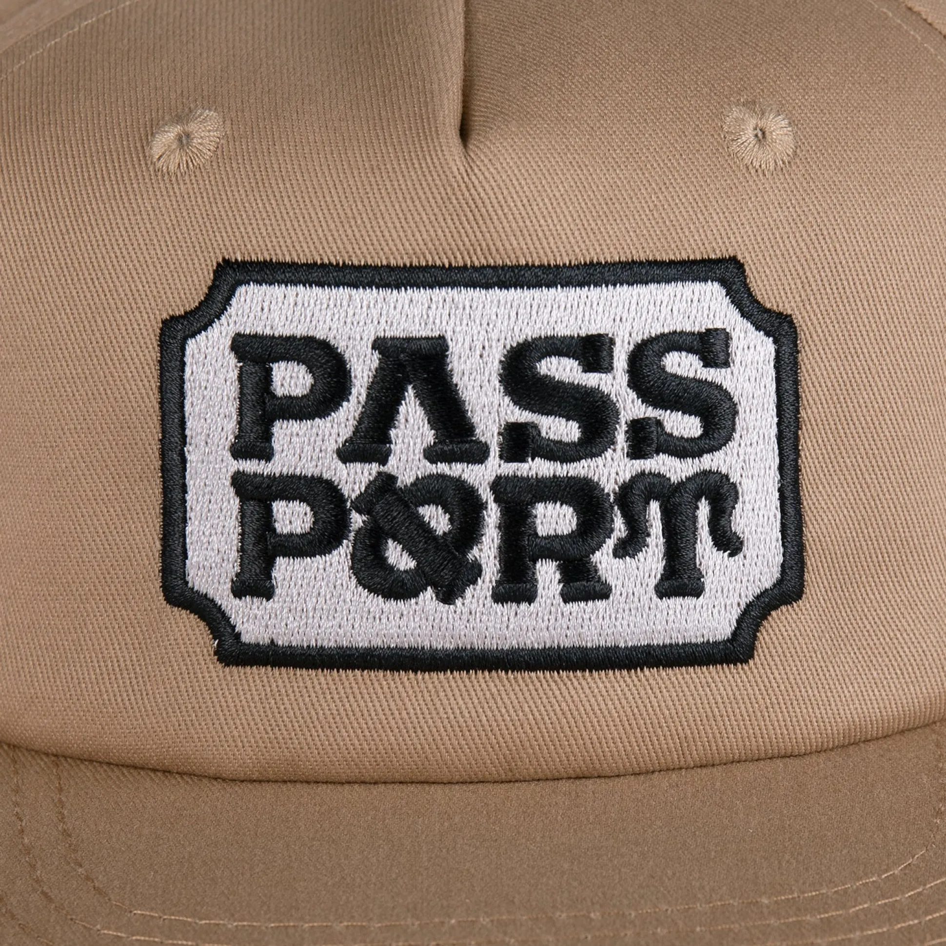 Pass~Port Yearbook Logo Workers cap in sand from range #42. The Pass~Port hat is a 5 panel construction made from 100% cotton and features direct embroidery on front with snapback adjustment.