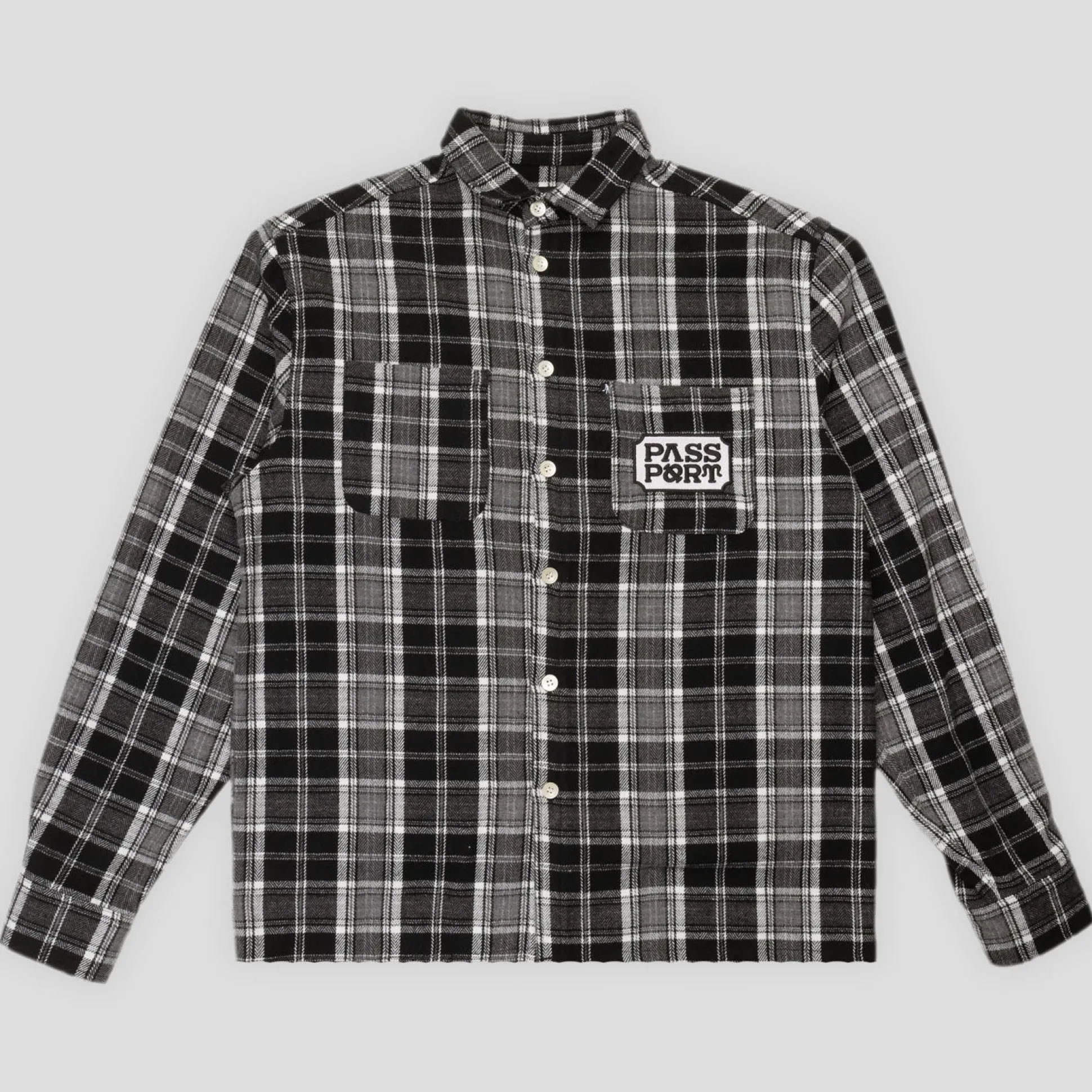 Pass~Port Yearbook Workers Flannel in black from range #42. The Pass~Port flannel is made from 100% poly flannel with patch embroidery on front. This heavy weight flannel also features double pocket on front.