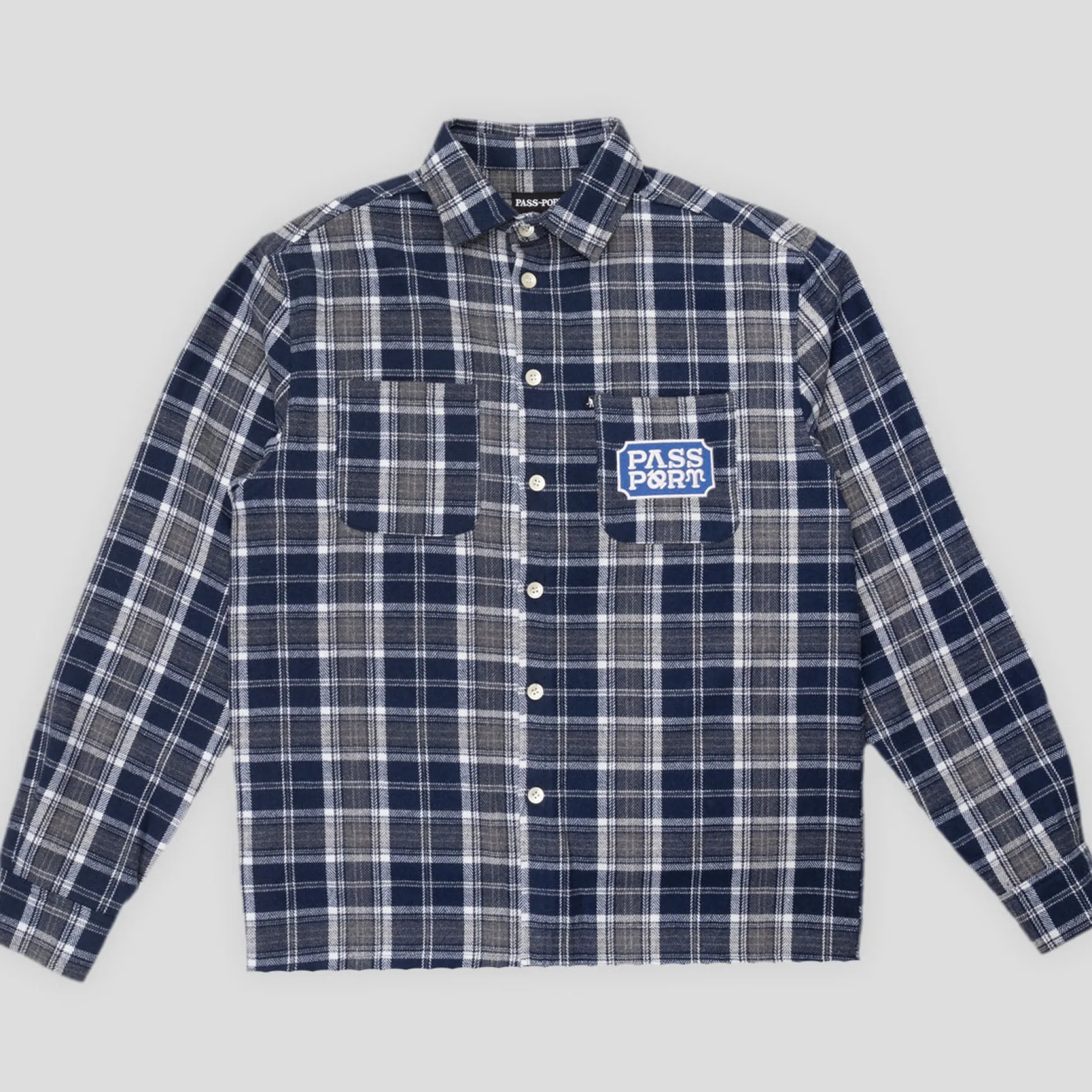 Pass~Port Yearbook Workers Flannel in navy from range #42. The Pass~Port flannel is made from 100% poly flannel with patch embroidery on front. This heavy weight flannel also features double pocket on front.