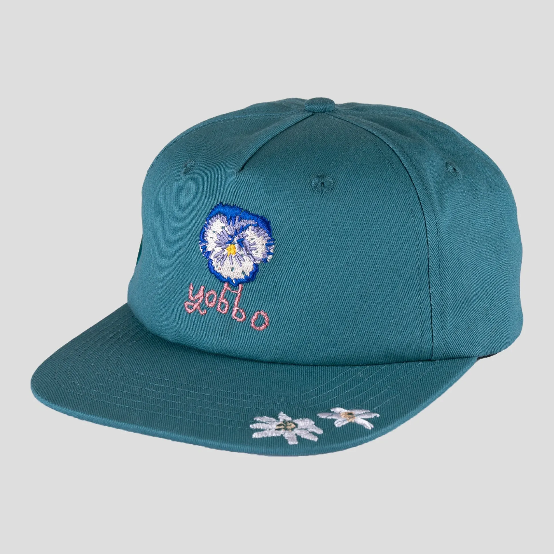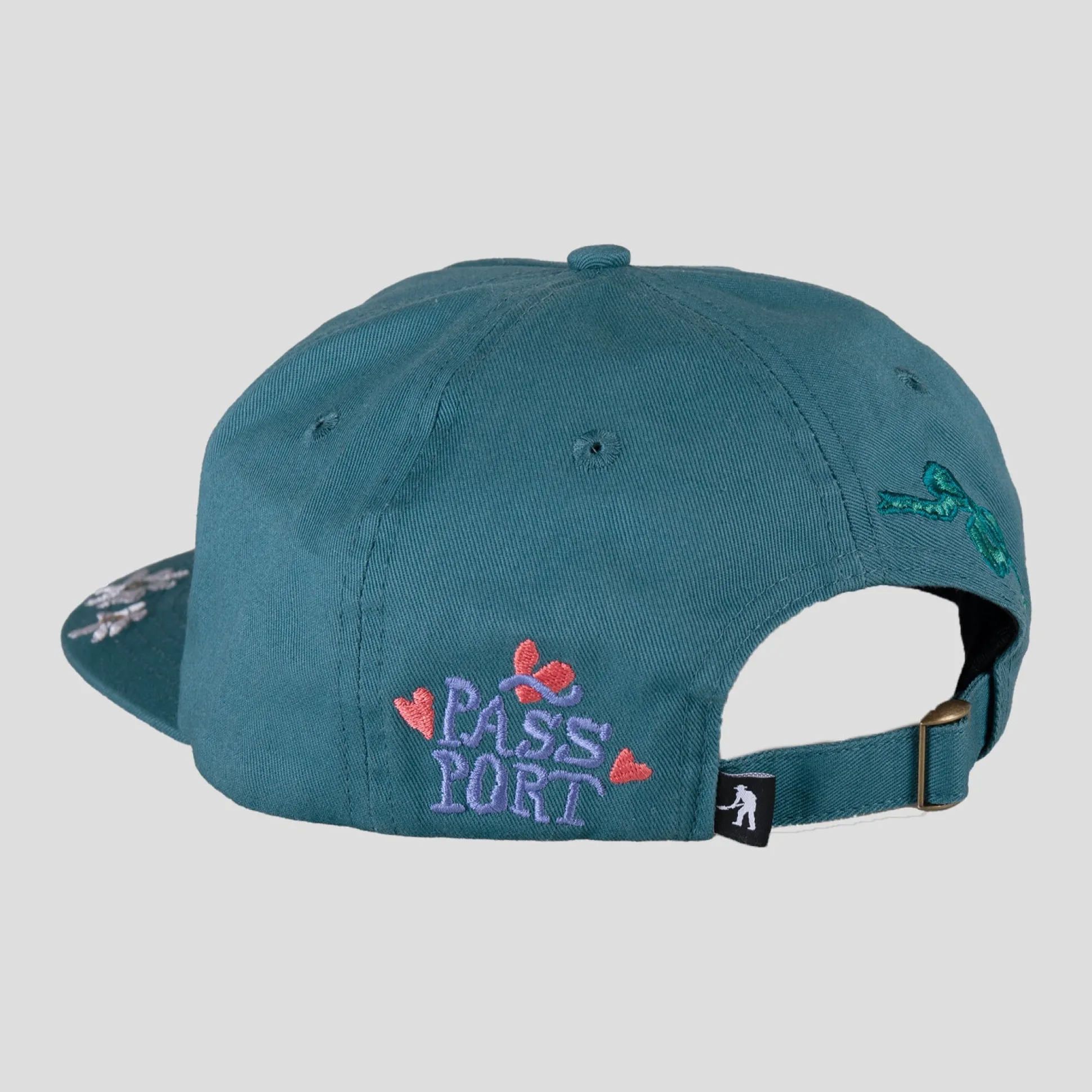 Pass~Port Yobbo workers cap from range #43. The Pass~Port hat is a 5 panel construction made from 100% cotton twill and features direct embroidery all over with strap back adjustment.