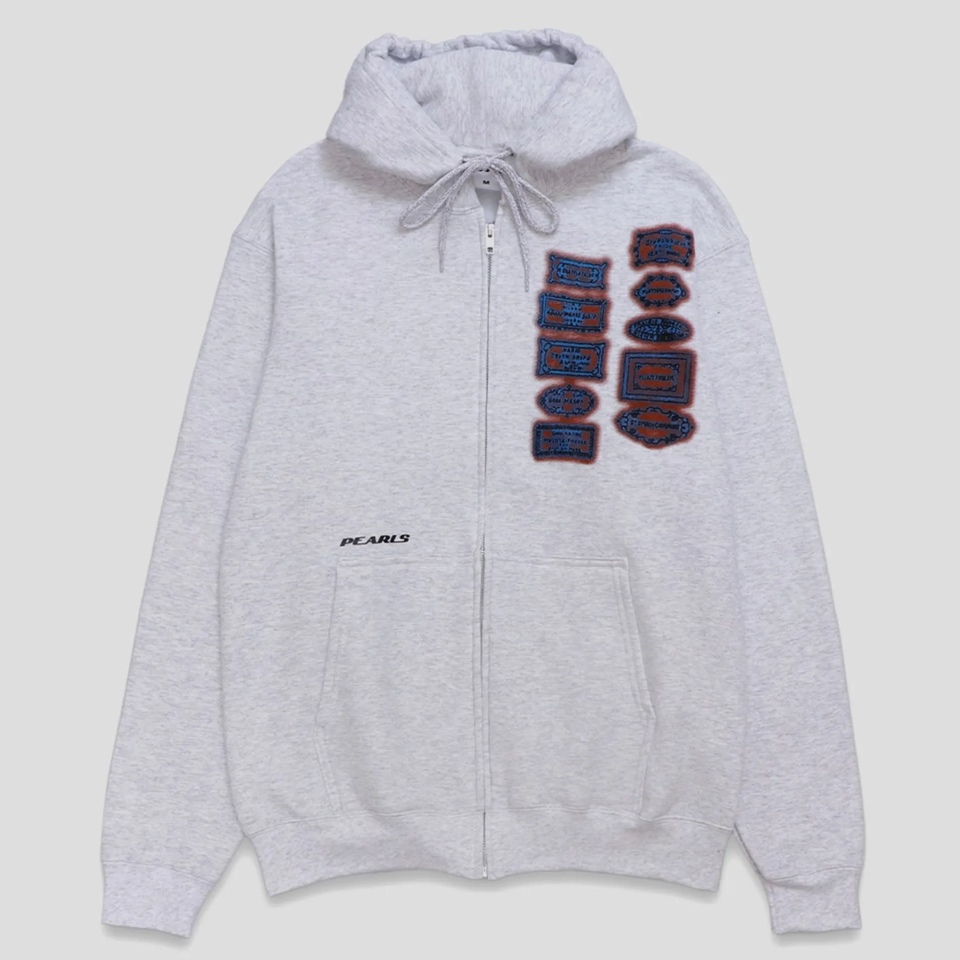 Pearls present their winter 24 range to Pass~Port Store & Gallery. The Ephemera Zip hood in ice marle is made from 100% poly / cotton which features screen printed graphic on front as well as full zip opening.