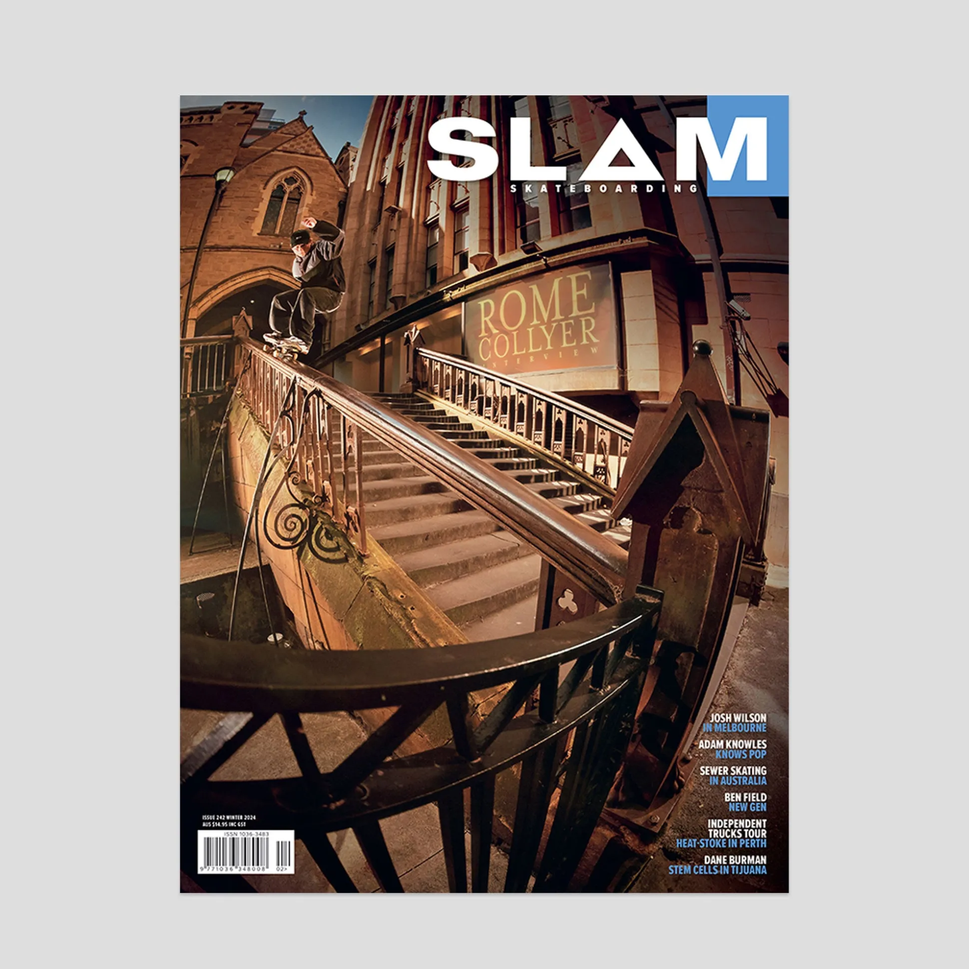 Slam Skateboarding Magazine Issue 242. The cover: The handrail of this 100-year-old stair set alongside St Paul’s Cathedral in Melbourne has sat idle from skateboarders for the past century until Rome Collyer gave it a grind. Frontside 50-50 pop out before the abrupt post at the end Photo by Bryce Golder Featuring articles on Rome Collyer, Josh Wilson, Adam Knowles and and much more.